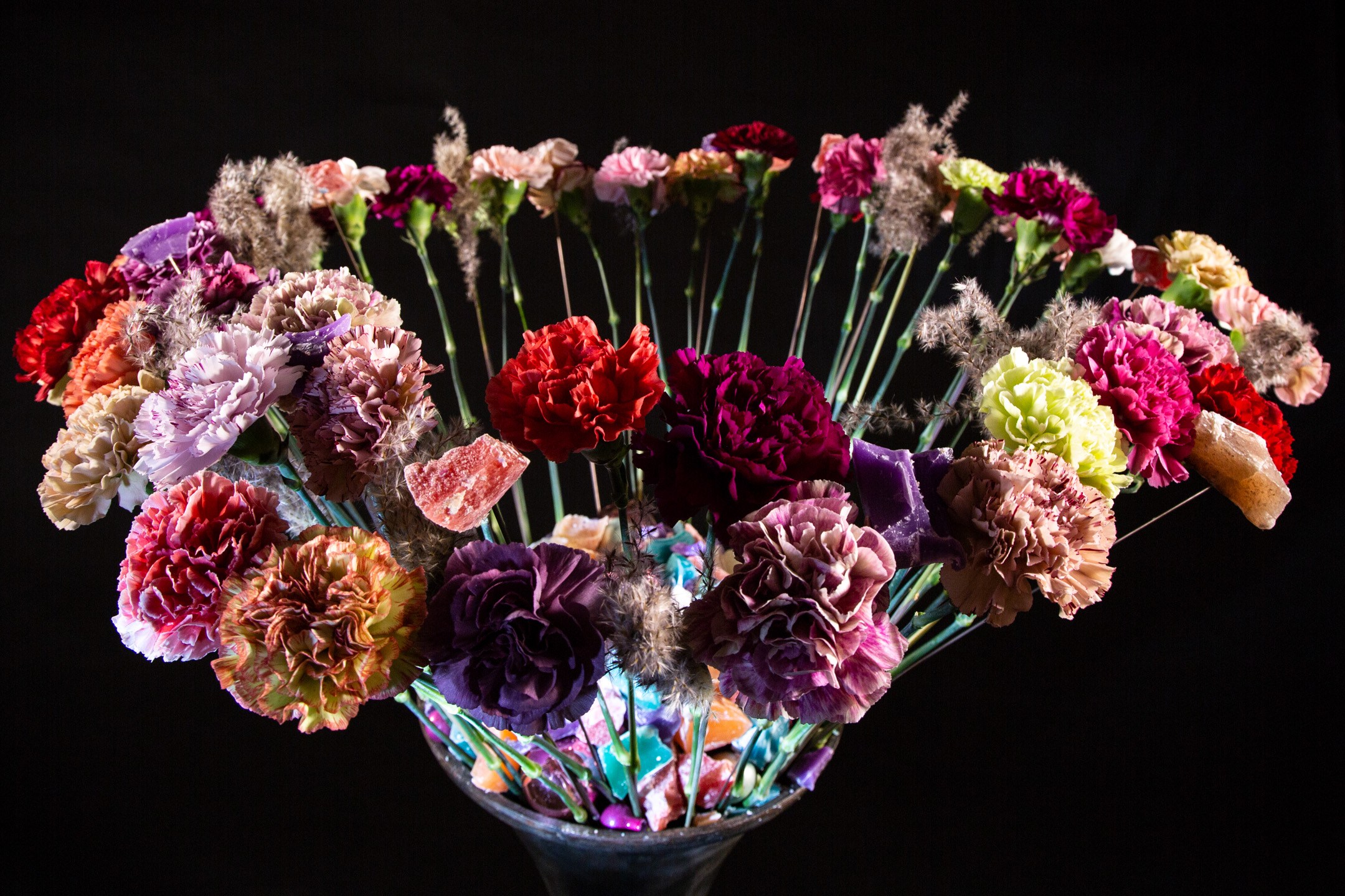 Om te laten zien hoe prachtig #TrendyDianthus zijn, heeft Roos van Unen dit bijzondere kerstbloemwerk gemaakt. Ze vulde het design met glitter en glamour en heel veel verschillende soorten anjers. Als basis gebruikte zij in stukken gehakte, kleurrijke kaarsen en kerstballen van waaruit de anjers hoog in de lucht torenen. Een indrukwekkend en feestelijk bloemwerk voor de kerst!