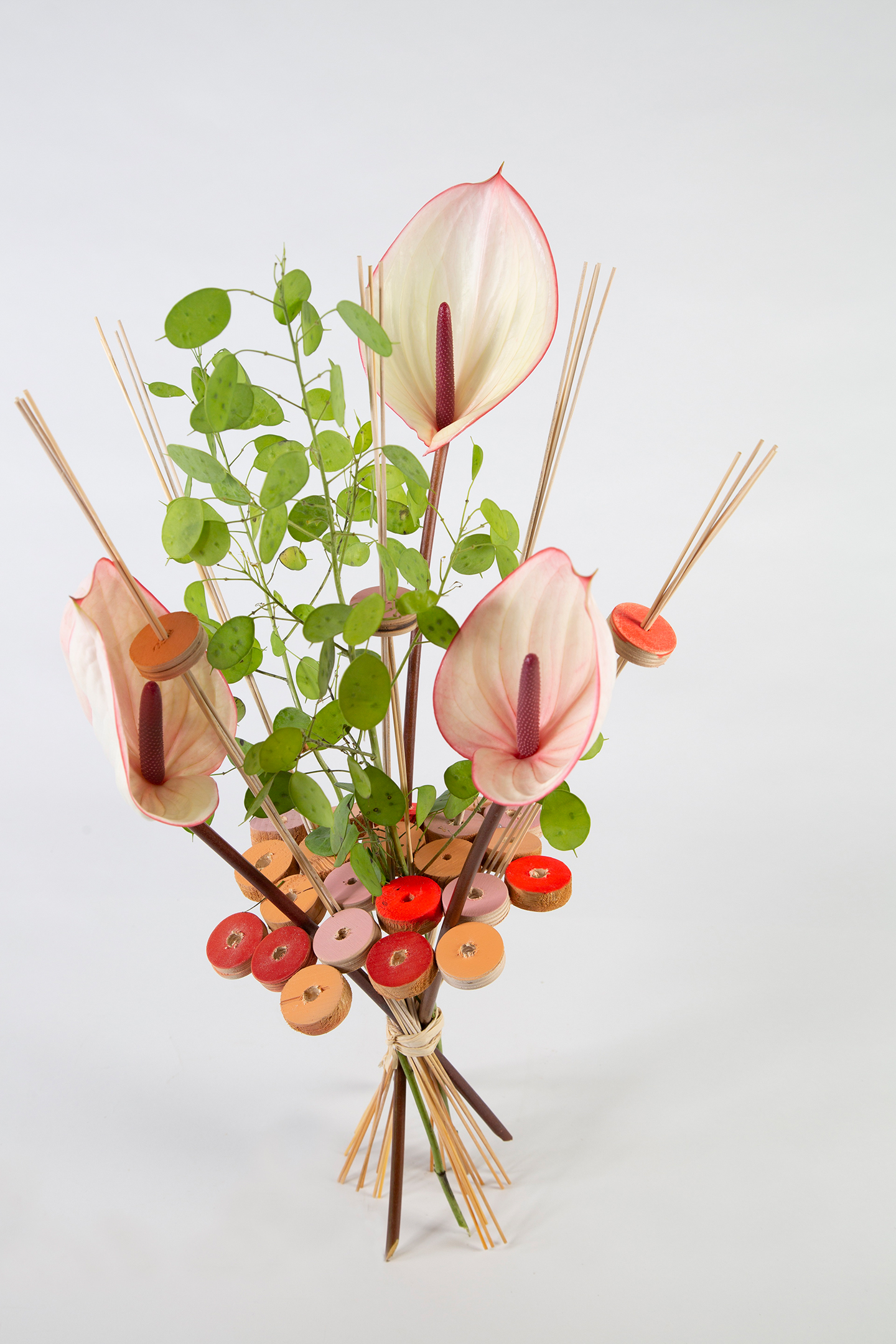 Snij Anthuriums op een verrassende manier gepresenteerd. Roos van Unen hergebruikte houten schijfjes die overbleven na het boren van grote gaten en gebruikte deze om een frame te creëren voor deze beauties!