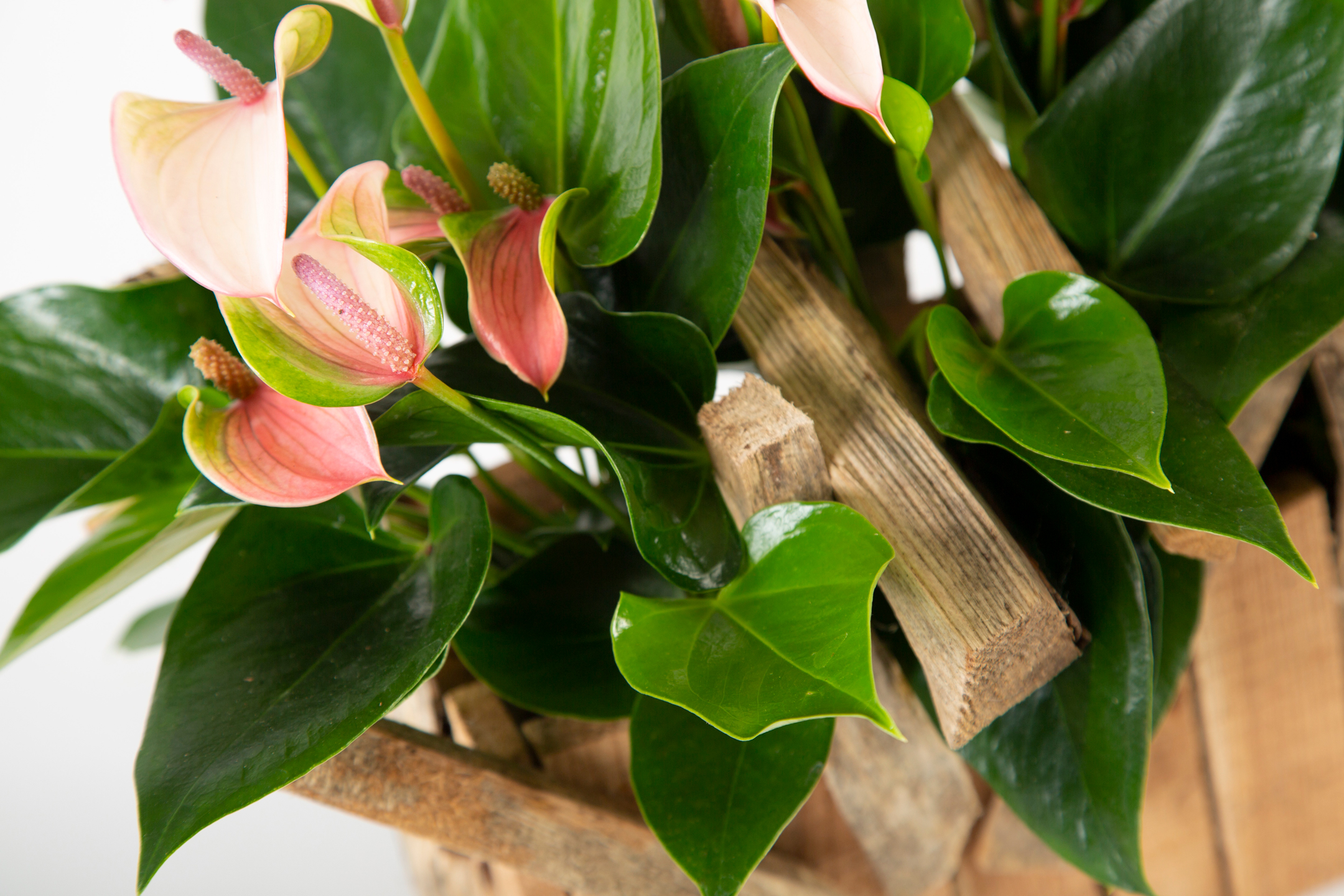 Voorbeeld van een mooie combinatie van hout met een weelderige groen Anthuriumplant. Design van Pim van den Akker.