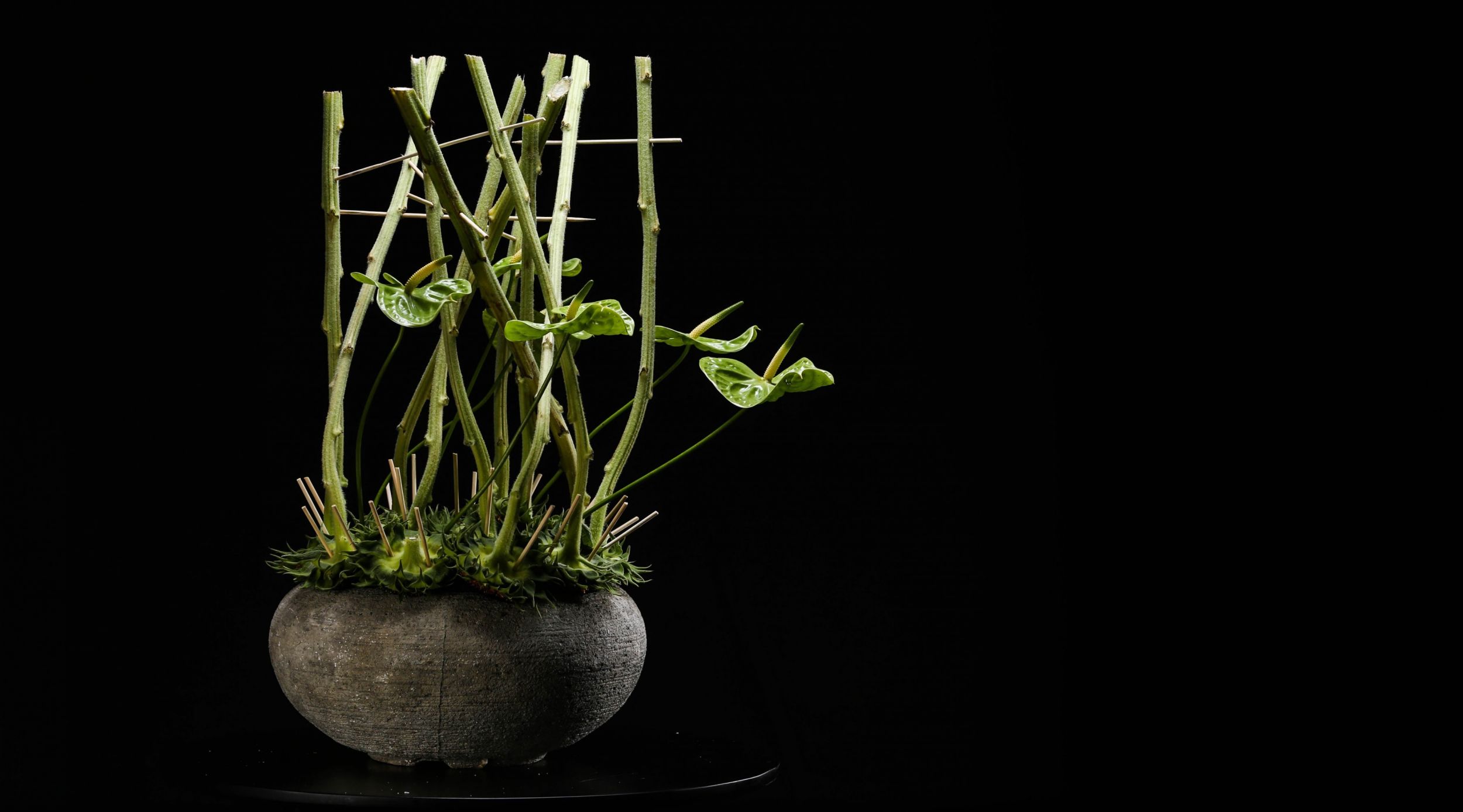 Voorbeeld van bloemwerk met de snij Anthurium Midori en zonnebloemen. Een ontwerp van Pim van den Akker wat laat zien dat je soms maar weinig componenten nodig hebt om een indrukwekkend stuk te maken.