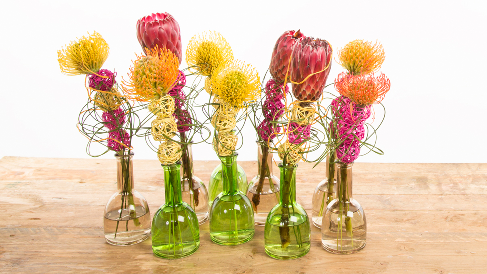 Een overvloed van gekleurde vaasjes en exotische bloemen zorgen voor een zomers arrangement.
