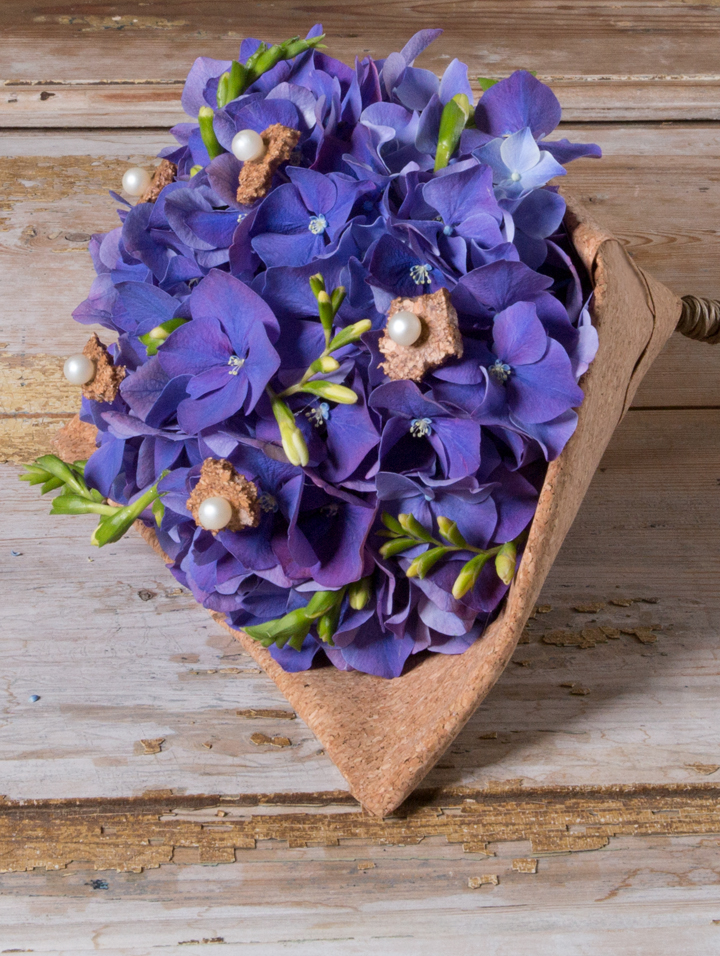 Een blauw trouwboeket van Pim van den Akker met Hortensia. Prachtige kleur en eenvoud! De basis is gemaakt van kurk en het materiaal komt terug als detail in het boeket.