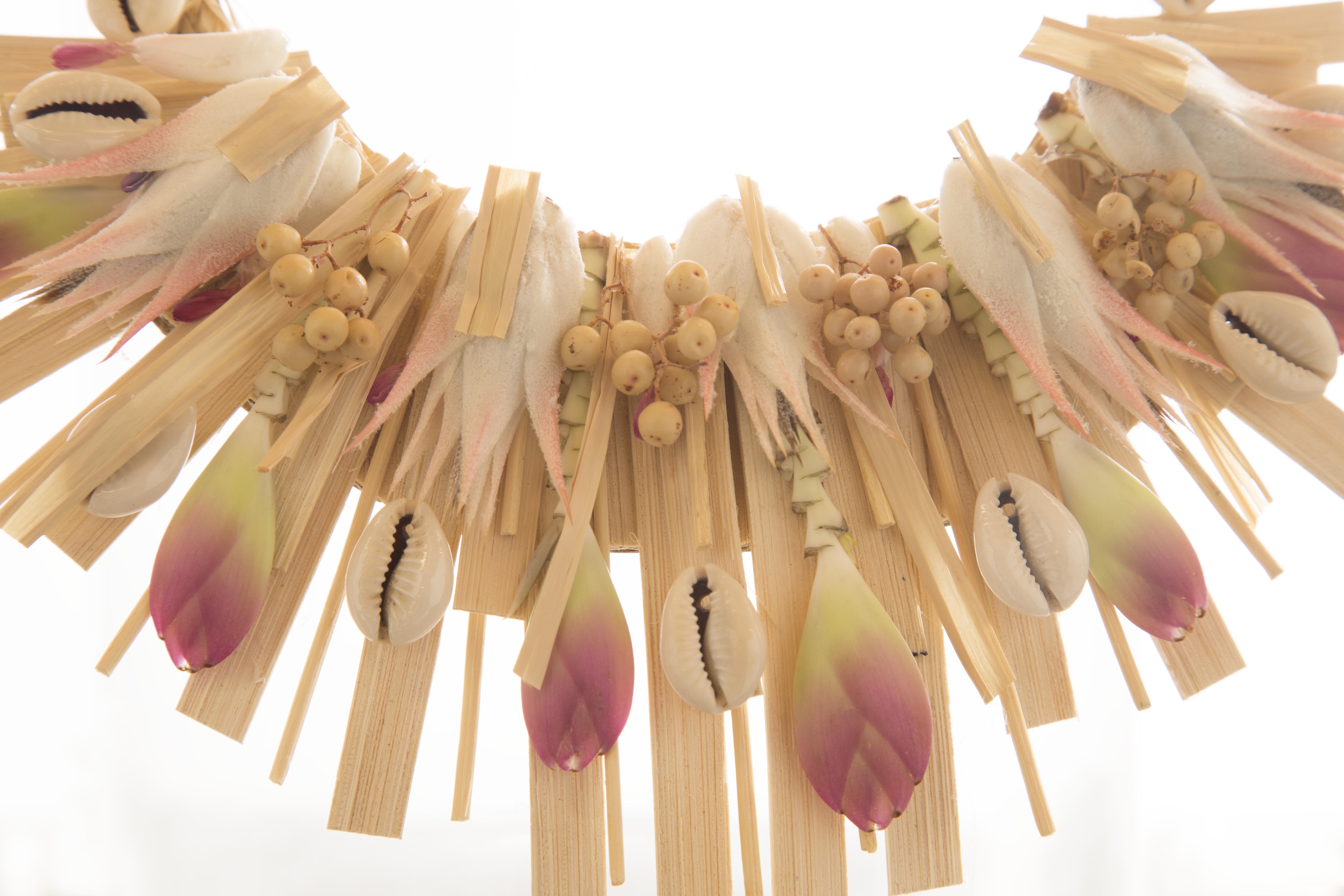 Detailfoto van de bloemenketting van Roos van Unen. Zij gebruikte Tillandsia en Achmea Primera bloemen in deze creatie.
