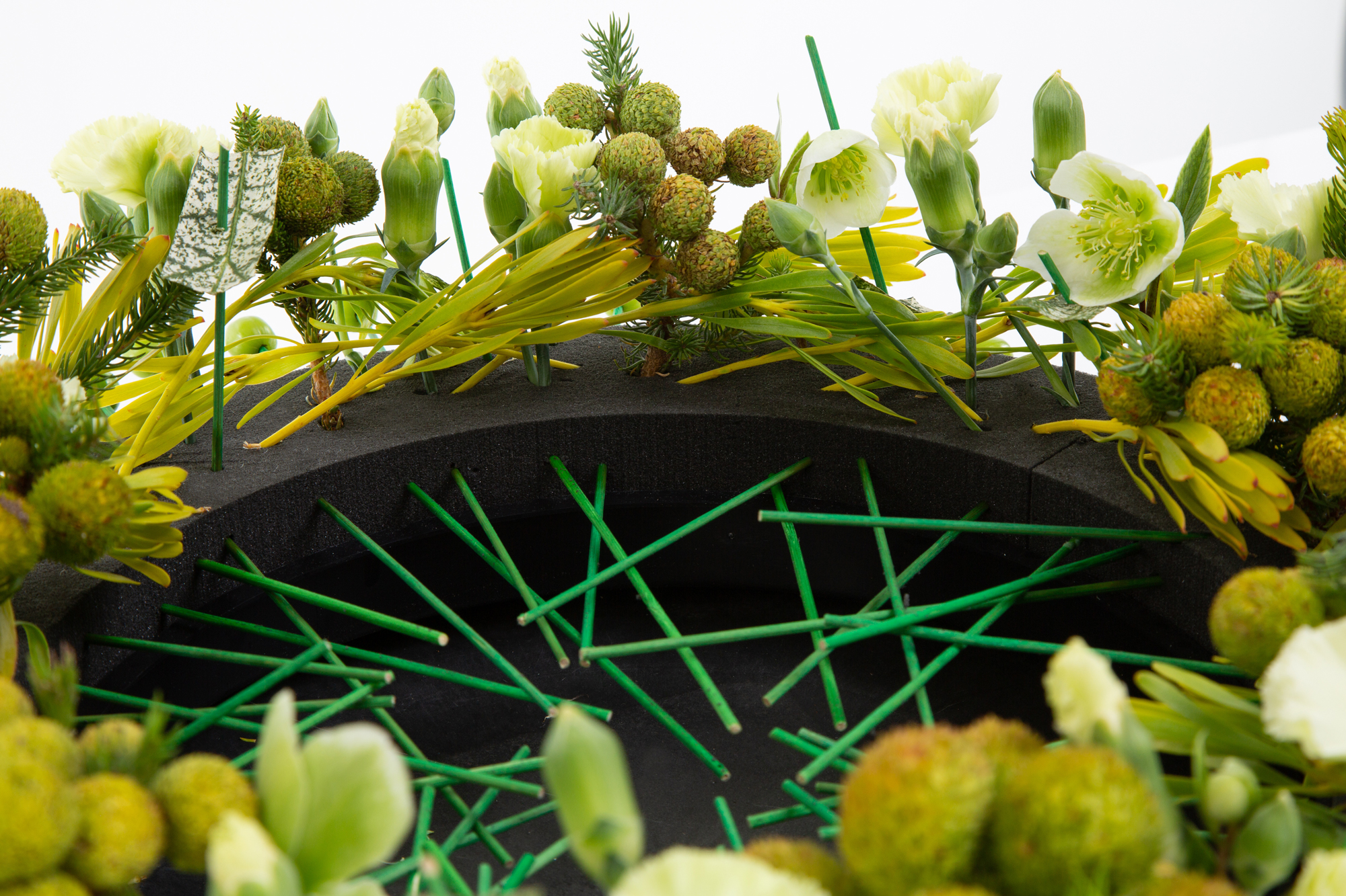 Een ring van OASIS® 'Black Ideal' steekschuim is de basis voor deze subtiele groene krans van Roos van Unen. Omdat dit zwarte steekschuim gezien mag worden is het slechts lichtjes ingevuld met anjers, Kaaps groen (Brunia Albiflora) en groene stokjes die afgewerkt zijn met Hypericum besjes.