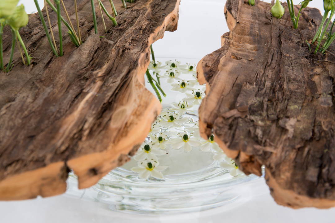 Detail van bloemwerk met Lisianthus. De boog over het water, de prachtige witte bloemen, het hout en de drijvende losse Ornithogalum bloemetjes in het water geven dit design van Roos van Unen een feeërieke uitstraling.