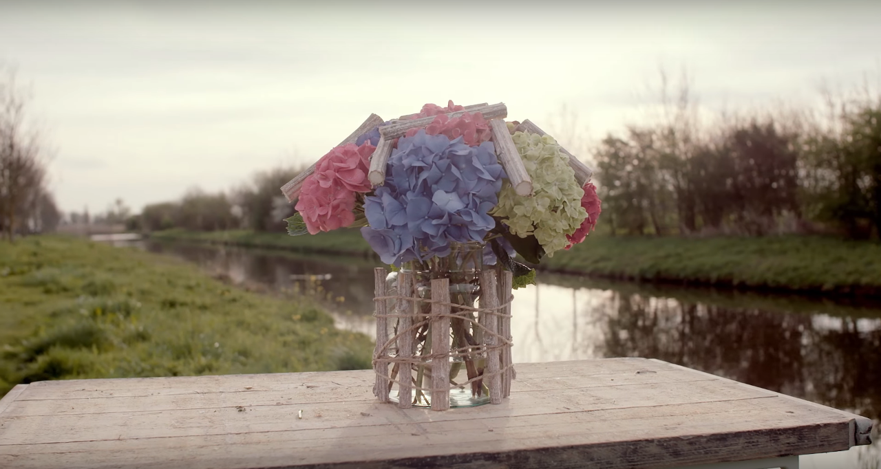 Pim van den Akker werkt graag met Hortensia's, zeker als je zulke prachtige soorten tot je beschikking hebt, waaronder de 'Verena', 'Pimpernel' en 'Rapsody'. Hij maakt een prachtig groot boeket en geeft er een leuke draai aan met gedroogde zonnebloemstelen.