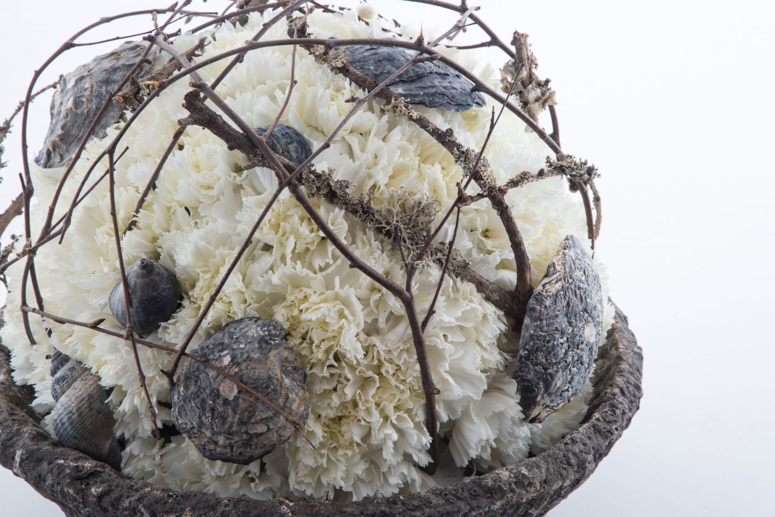 Roos van Unen heeft een uniek bolvormig rouwarrangement met een wilde natuurlijke uitstraling gemaakt met serene witte anjers. Het spel van de verschillende takken (berken takken en bemoste takken) in combinatie met de grillige schaal zorgt voor een woest, maar sereen rouwarrangement. De schelpen en de beweging die gecreeërd wordt door de takken doet denken aan het strand en de wind.