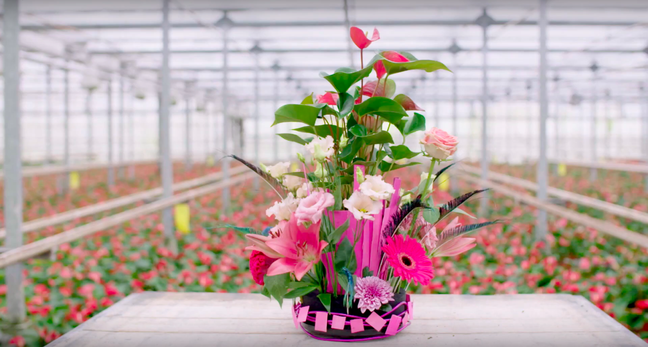 Een idee voor een uitbundig planten arrangement met 'Adios Dynamite' Anthurium plant door Nelleke Bontje. Want waarom zou je je beperken tot alleen planten in een planten arrangement? Nelleke voegt vrolijke bloemen toe door gebruik te maken van een ring van zwart Oasis steekschuim.