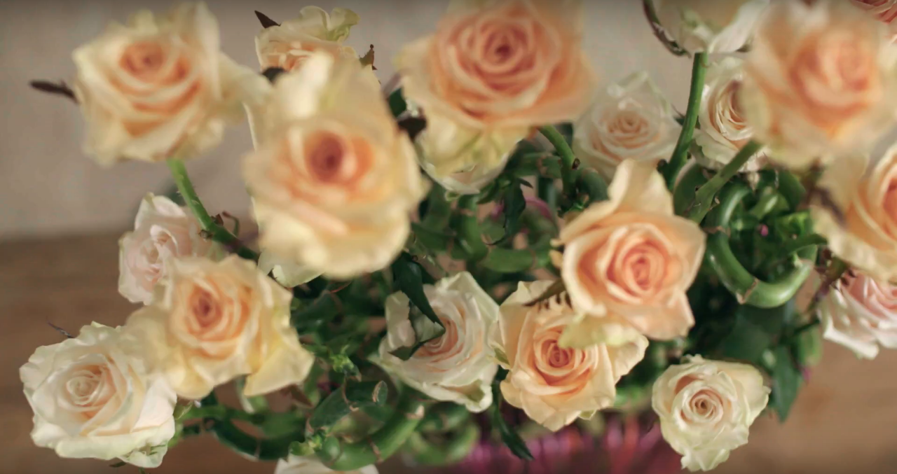 Twee mooie soorten rozen zijn opnieuw geïntroduceerd door Arend Roses: De mooie creme/champagne gekleurde Talea+ en de zacht roze/oranje Prima Donna+. Prachtige chique kleuren die perfect passen bij een feestelijk ontwerp gemaakt door bloemstylist Chantal Vollenbroek. Ze gebruikt het decoratieve draad ook slim; ze geven het bloemstuk namelijk veel stevigheid en het voegt leuke details toe aan de simpele glazen vaas.