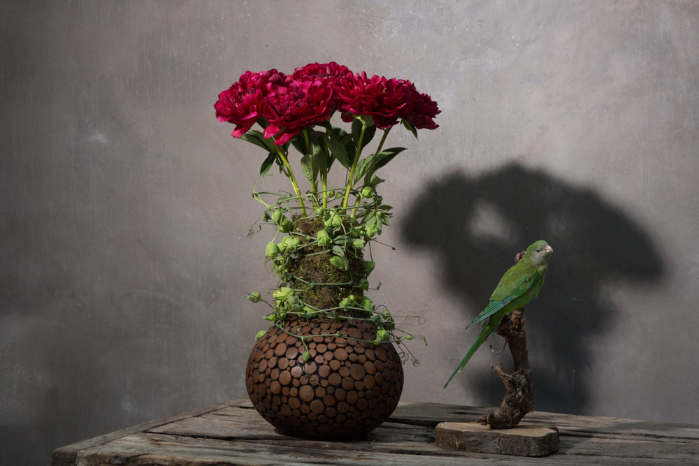 Pim van den Akker maakt met de prachtige pioenroos 'Henry Bockstoce' van the My Peony Society een krachtig arrangement. De natuurlijke kleuren van de basis accentueren de diepe, intense kleur van de krachtige pioen. Passiflora ranken zijn toegevoegd om een elegante beweging in het design te creeëren.