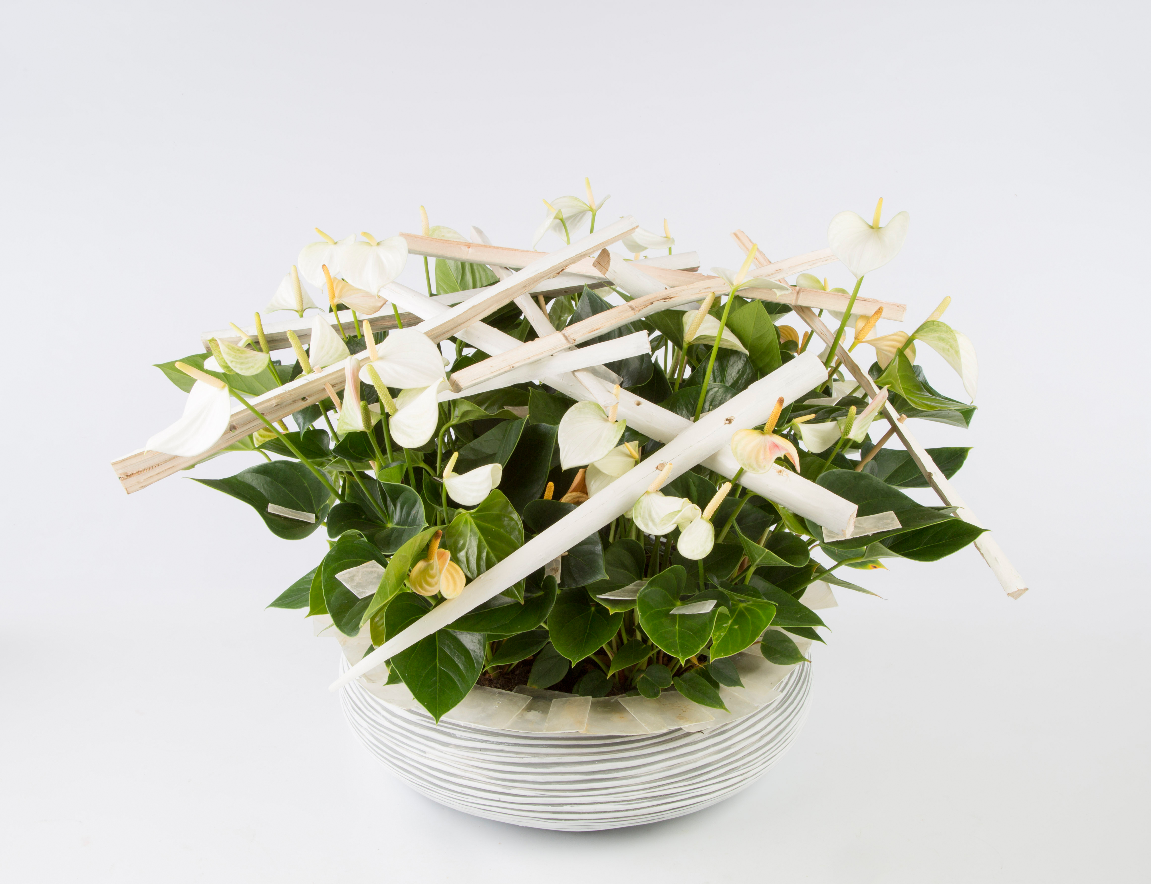 De prachtige Adios® White Anthuriums hebben niet veel nodig, maar iets van detail toevoegen is altijd een goed idee!