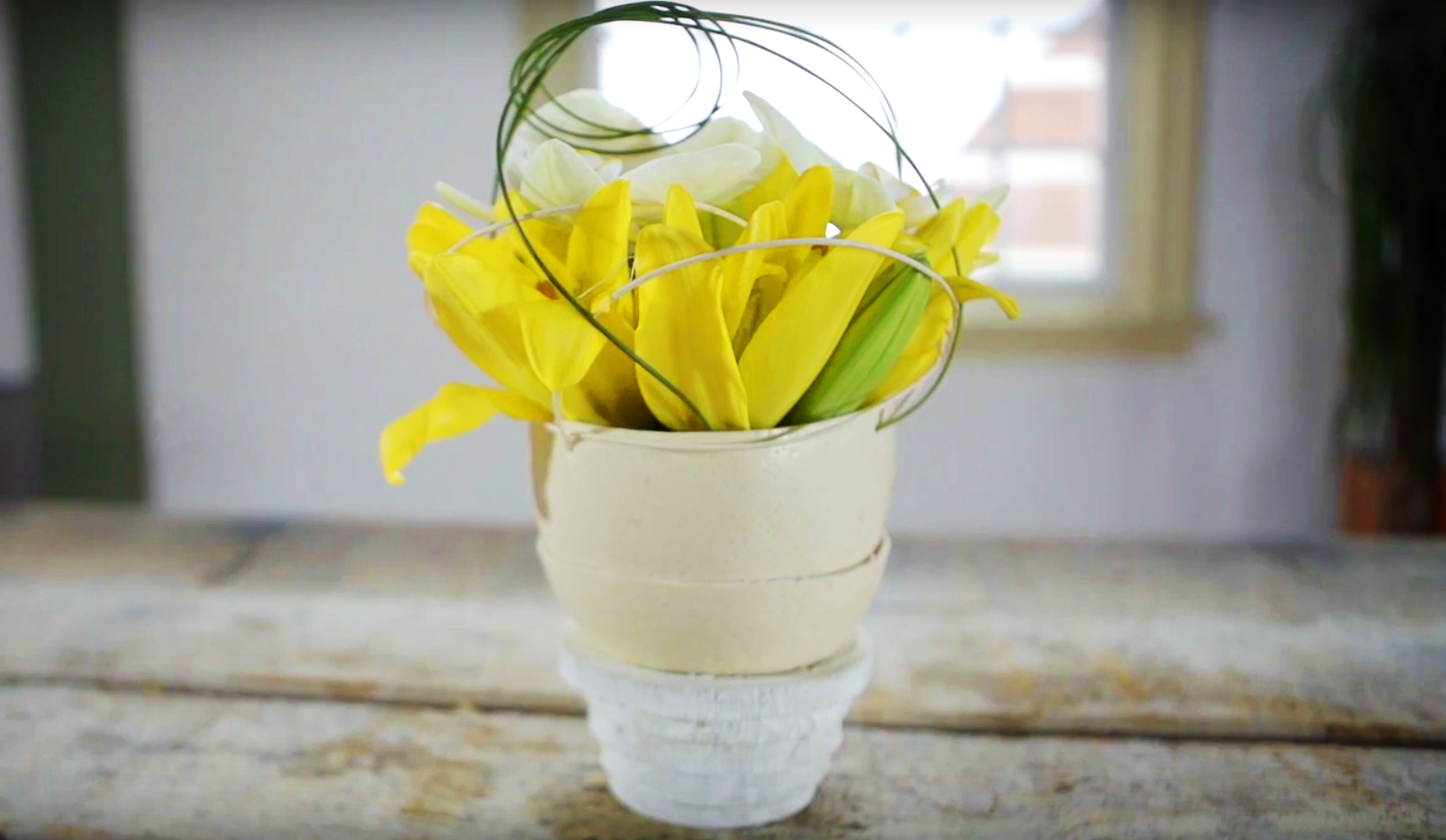 Simpel en elegant design met een struisvogelei, lelies en orchideeën. Lief paasarrangement.