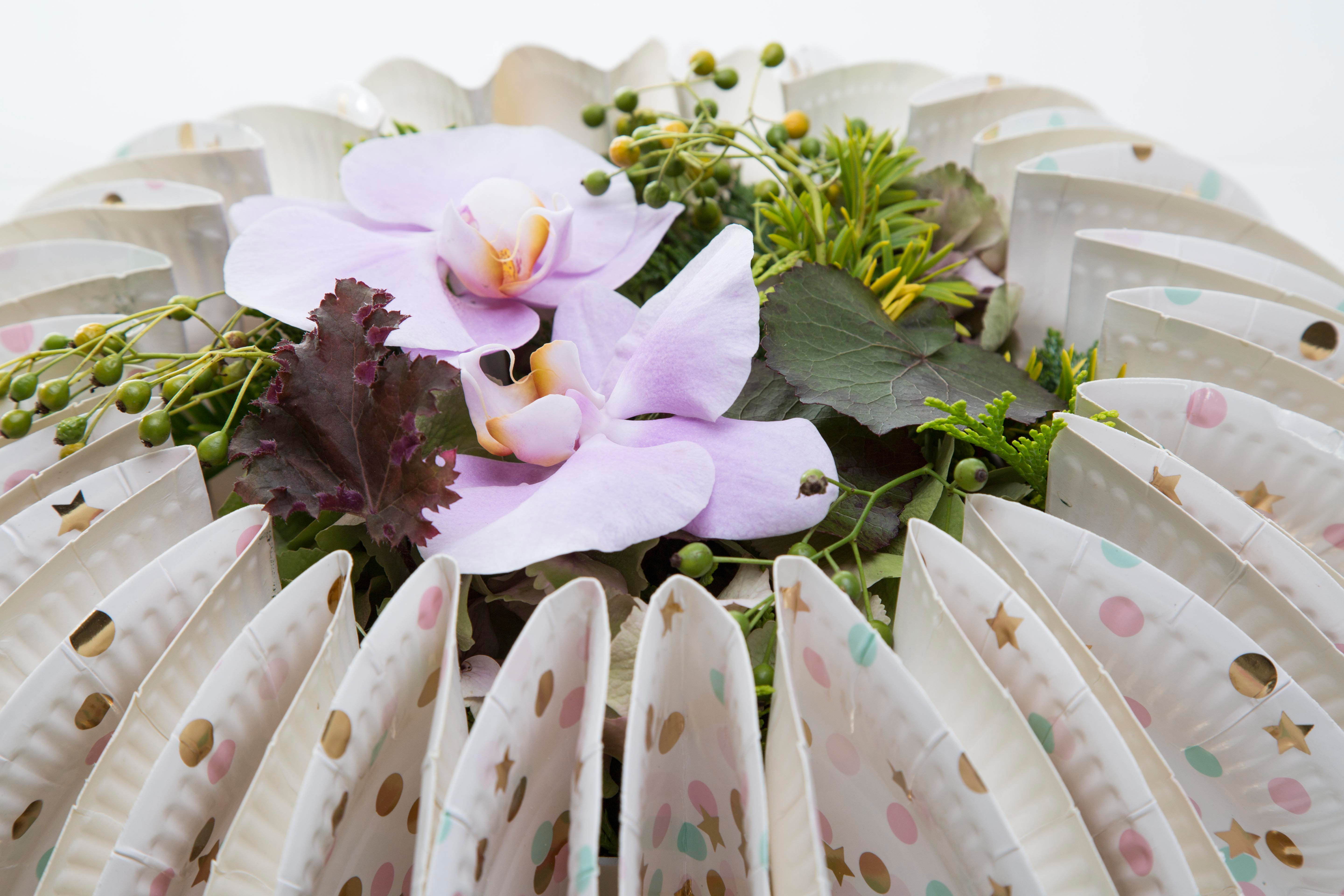Bloemsierkunstenaar Bea Beroy verwerkt graag bescheiden materialen op een verrassende manier in haar bloemwerk. Een goed voorbeeld hiervan is dit grappige bloemwerk voor de feestdagen. Ze maakt een basis door gevouwen papieren bordjes aan een schaal van Oasis te lijmen. Geeft gelijk een leuk effect! Paar bloemen in het steekschuim en klaar. Ze laat je zien hoe eenvoudig het is in deze video.