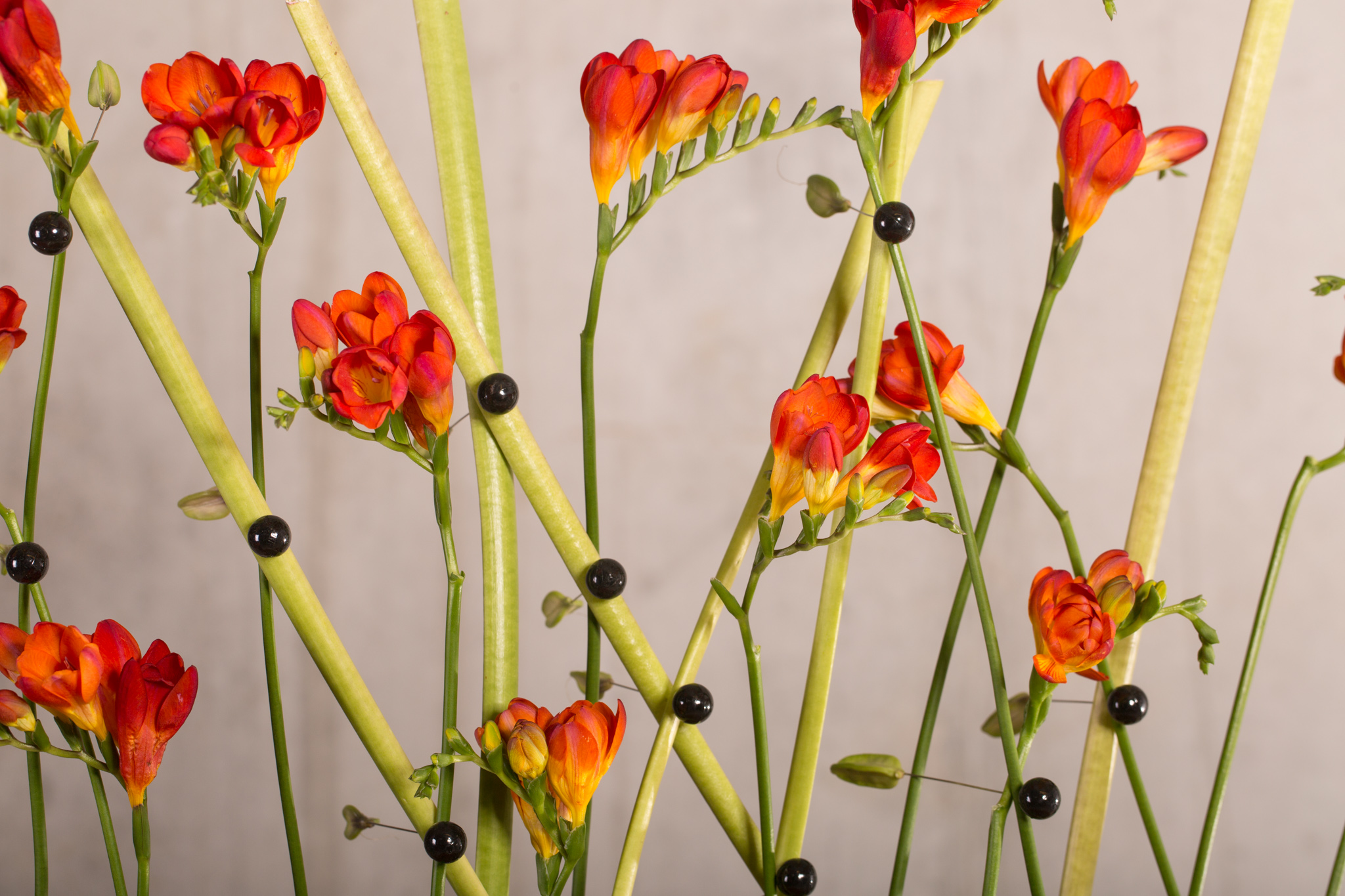 De elegante stelen van de Freesia mogen gezien worden! Roos van Unen koos prachtige rode Freesia's en spelde deze samen met Agapanthus om een frame te maken. Ze zwarte parels zijn afgewerkt met een zaaddoos van de Agapanthus. Het geheel is geplaatst in een gedroogd bananenblad wat op pootjes is gezet. Een bloemwerk wat ieder moment van de tafel lijkt te kunnen lopen. Grappig en door de kleuren toch heel kerst.