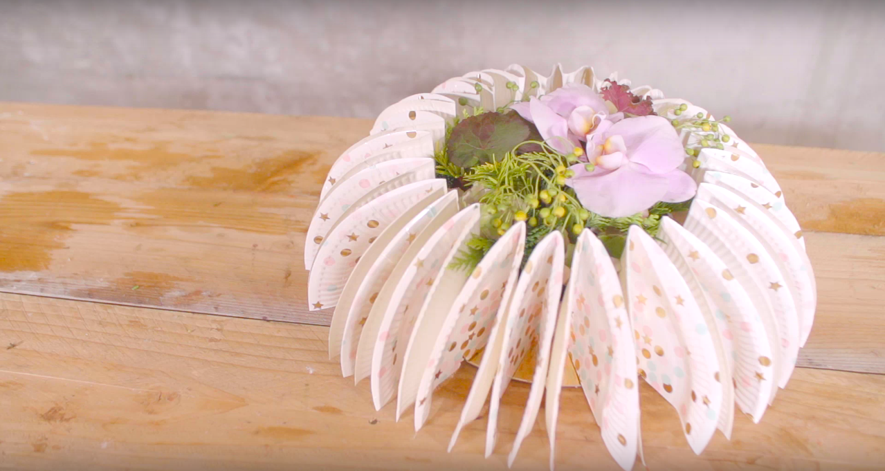 Bloemsierkunstenaar Bea Beroy verwerkt graag bescheiden materialen op een verrassende manier in haar bloemwerk. Een goed voorbeeld hiervan is dit grappige bloemwerk voor de feestdagen. Ze maakt een basis door gevouwen papieren bordjes aan een schaal van Oasis te lijmen. Geeft gelijk een leuk effect! Paar bloemen in het steekschuim en klaar. Ze laat je zien hoe eenvoudig het is: