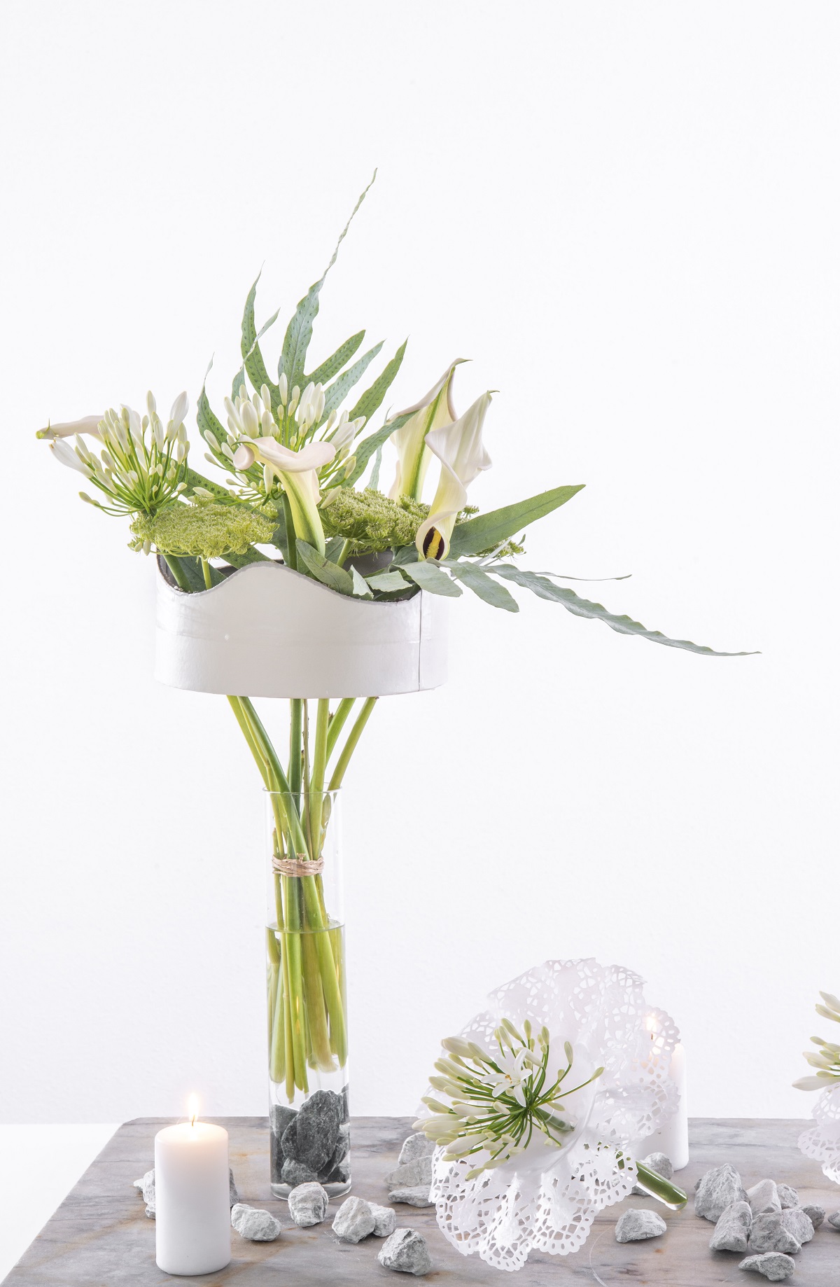 Een kartonnen hoedendoos en een paar Biedermeier manchetes worden getransformeerd tot feestelijke tafeldecoraties. Pim van den Akker laat zien hoe makkelijk en leuk het is om met kant-en-klare bloemisterij-artikelen te werken. Gebruik je fantasie en bedenk hoe je dit soort producten op een originele manier kunt toepassen in je bloemwerk.