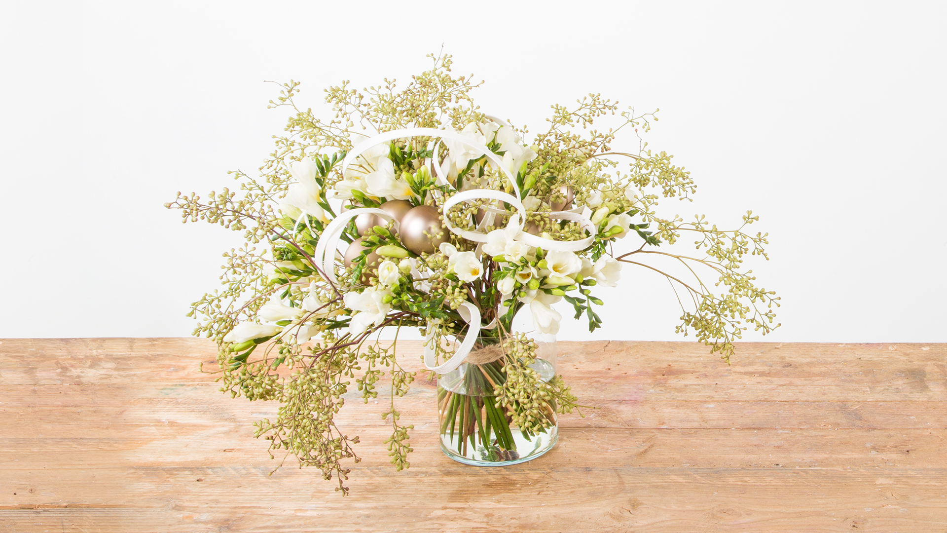 Rotan en Freesia's zorgen voor een stijlvol frameboeket. De technieken knopen en verbinden en omwikkelen zijn toegepast in dit ontwerp.