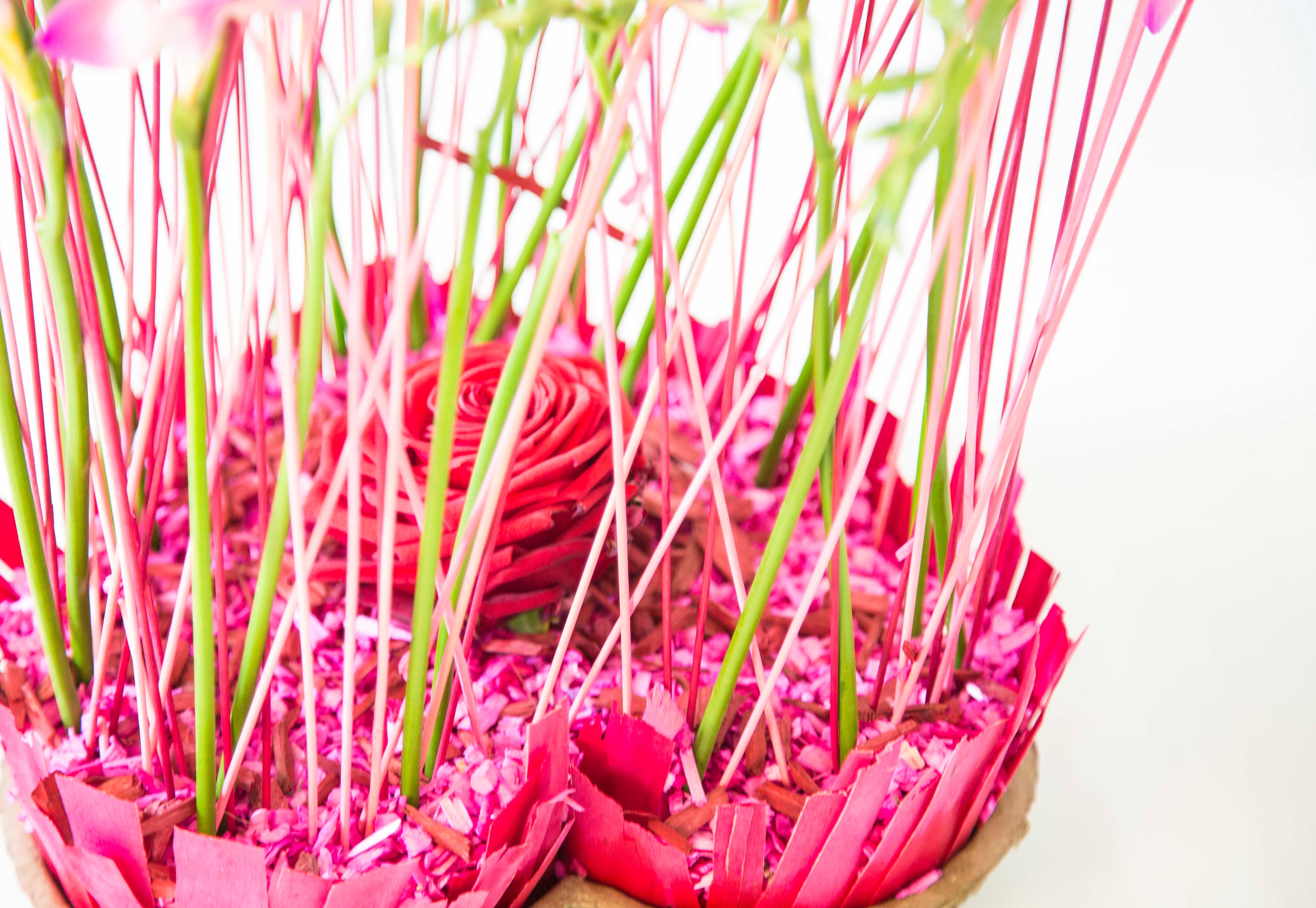 Dit arrangement met hartvorm is anders dan anders vanwege de hoogte van de freesia's. Door ze op deze manier te gebruiken betekend dat de stelen ook een belangrijk onderdeel zijn van het ontwerp. Een origineel en heerlijk ruikend bloemstuk voor Valentijn door Nelleke Bontje!