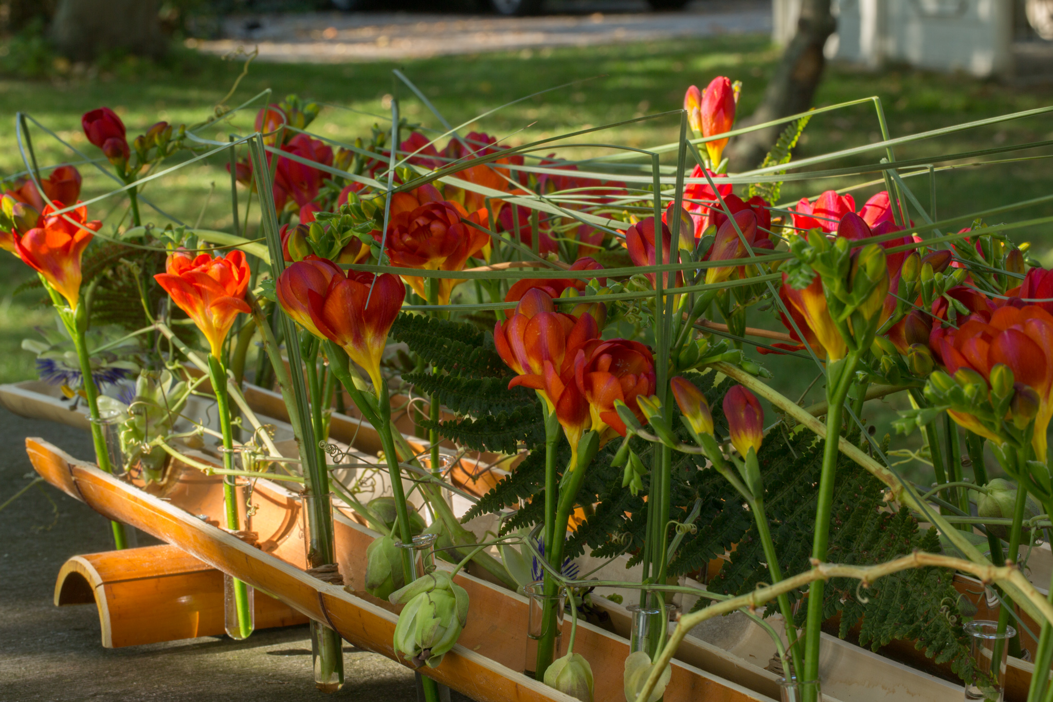 Voorbeeld van een afscheidsbloemwerk met Freesia's. Aangezien de Freesia een favoriete bloem van velen is, is het mooi om deze ook in rouwwerk te gebruiken. Pim van den Akker maakte een groot werk op een basis van gespleten bamboe. Hij boorde gaten in de constructie waarin de glazen buisjes perfect pasten. Oranje en rode Freesia's sieren de constructie samen met een enkel varenblad en ranken Passiflora.