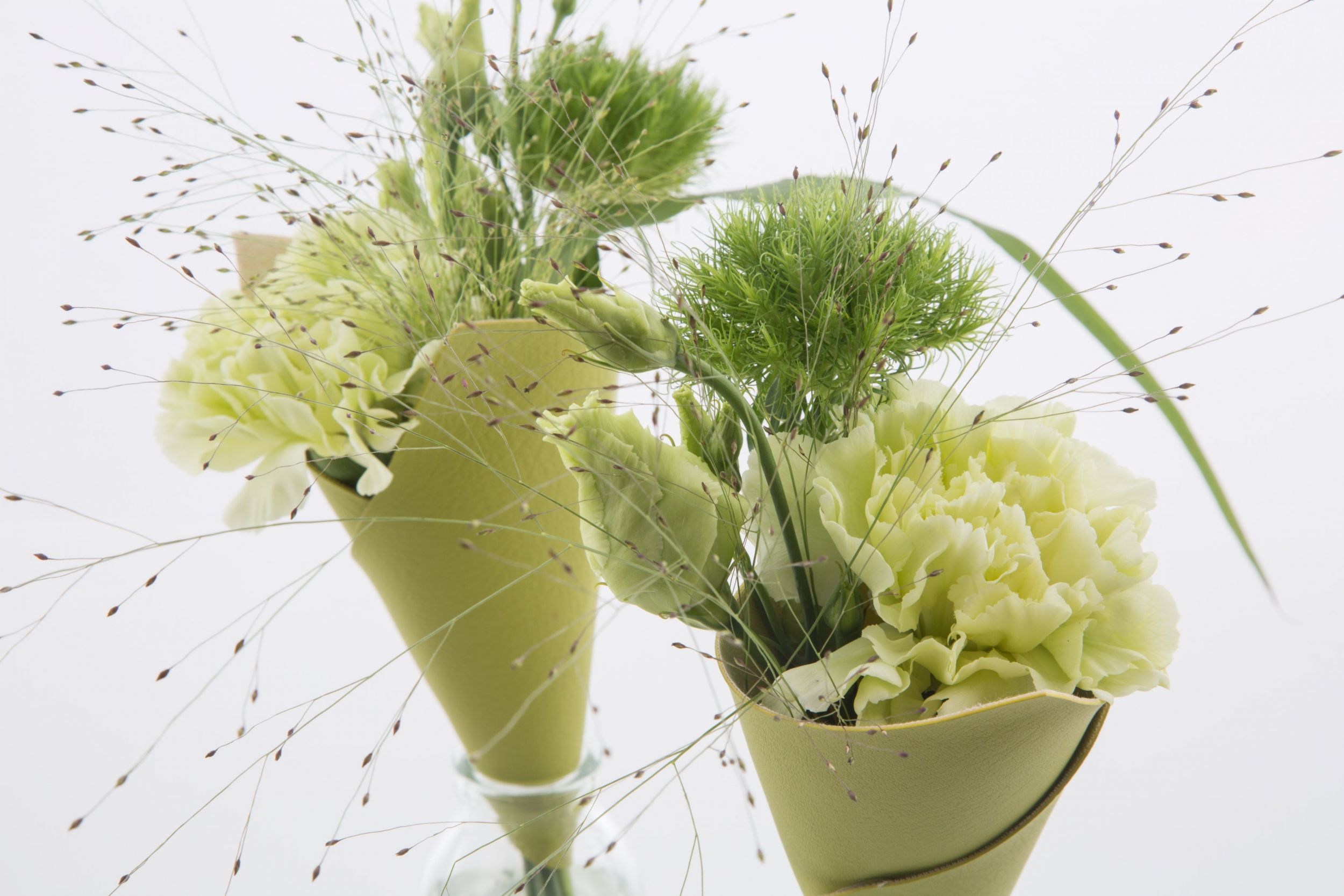 Roos van Unen heeft een origineel boeket gemaakt met verschillende soorten trendy Dianthus. De frisse groene en witte tinten van de Dianthus en Lisianthus zorgen voor een vrolijk en natuurlijke uitstraling. Het boeket is anders vormgegeven. Van leren lappen zijn kegels gemaakt waarbij de onderkant open is gelaten. Voor stevigheid is er een houten halve cirkel gebruikt als basis. De bloemen zijn door de gaten heen gestoken en worden als boeket gebonden. De Rhipsalis en Panicum virgatum die als detail toegevoegd zijn, zorgen voor een mooie neerwaarste beweging.