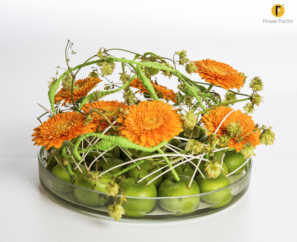 Gerbera's en appels zijn een perfecte combinatie in deze lenteschikking.