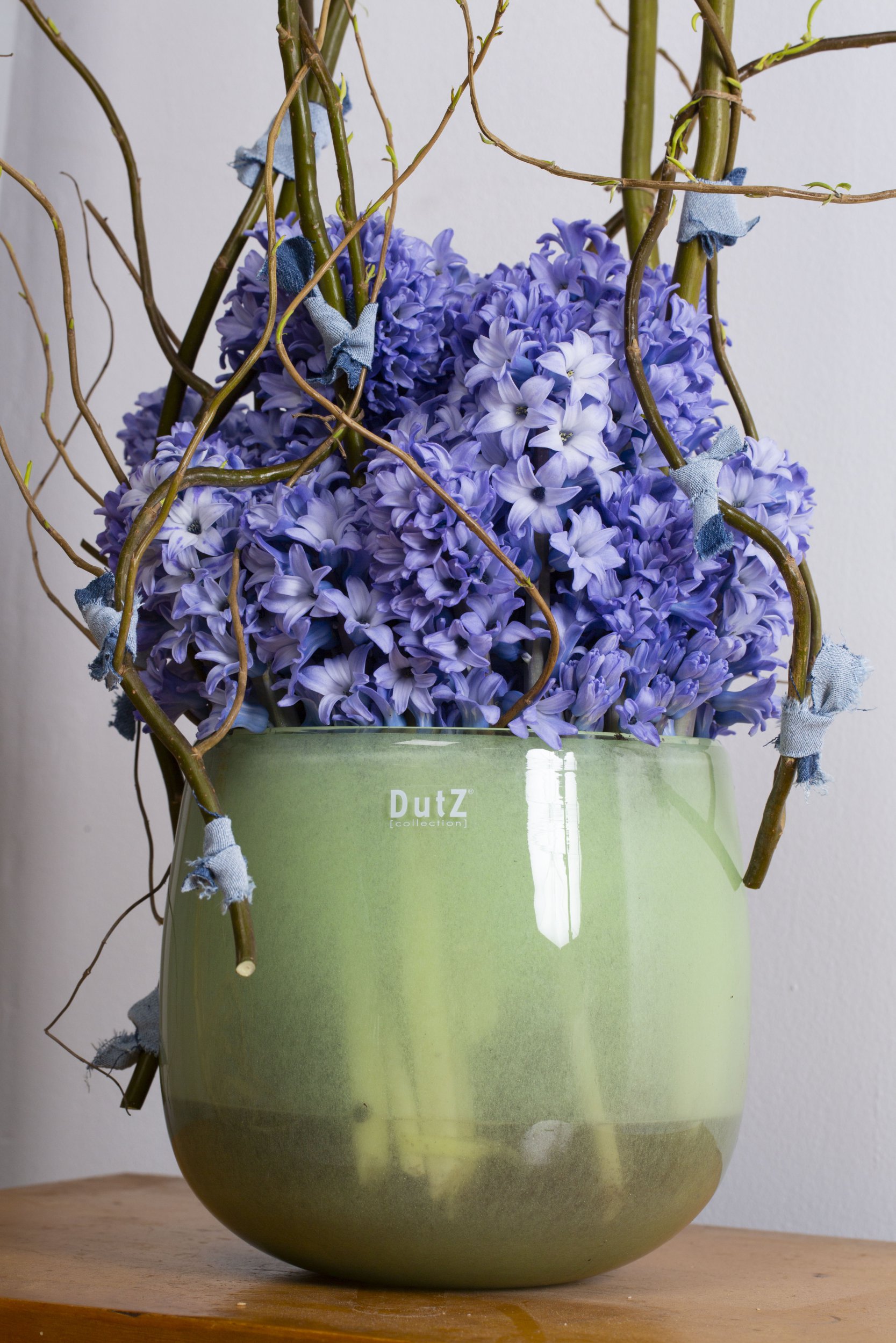 Roos van Unen maakte dit heerlijk geurende Moederdag arrangement met blauwe Hyacinten en grillige takken in een frisgroene vaas. Er is gekozen om de Hyacinten in steekschuim te steken zodat de stelen gemakkelijk op verschillende hoogtes verwerkt konden worden. Als speels detail zijn kronkelende Salix takken en stukjes geknoopte spijkersstof toegevoegd.