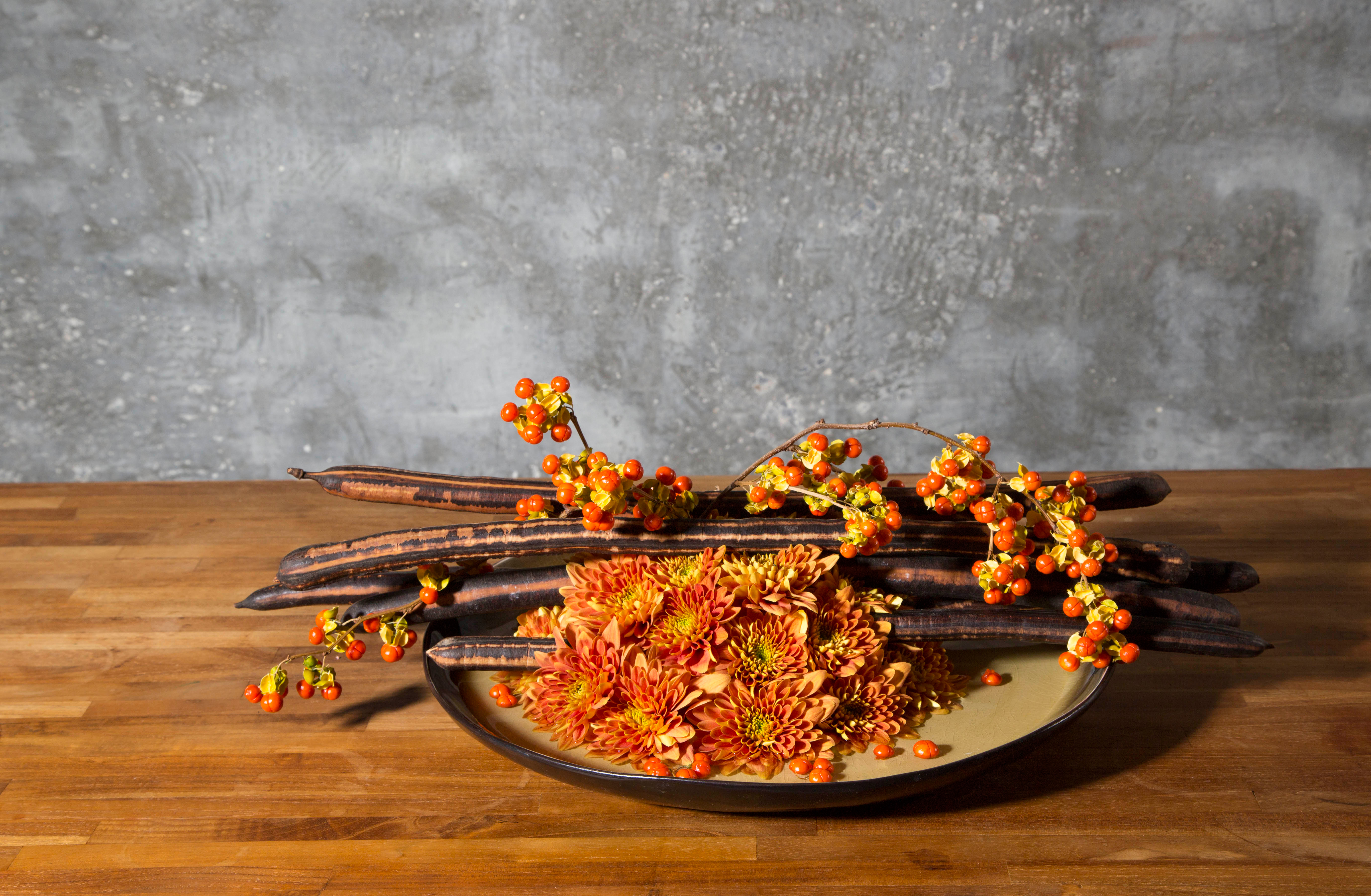 Een prachtige herfstschaal vol met 'Bartoli' chrysanten, Celastrus en gedroogde bonen. Mooie combinatie met verschillende structuren en complimenterende kleuren.