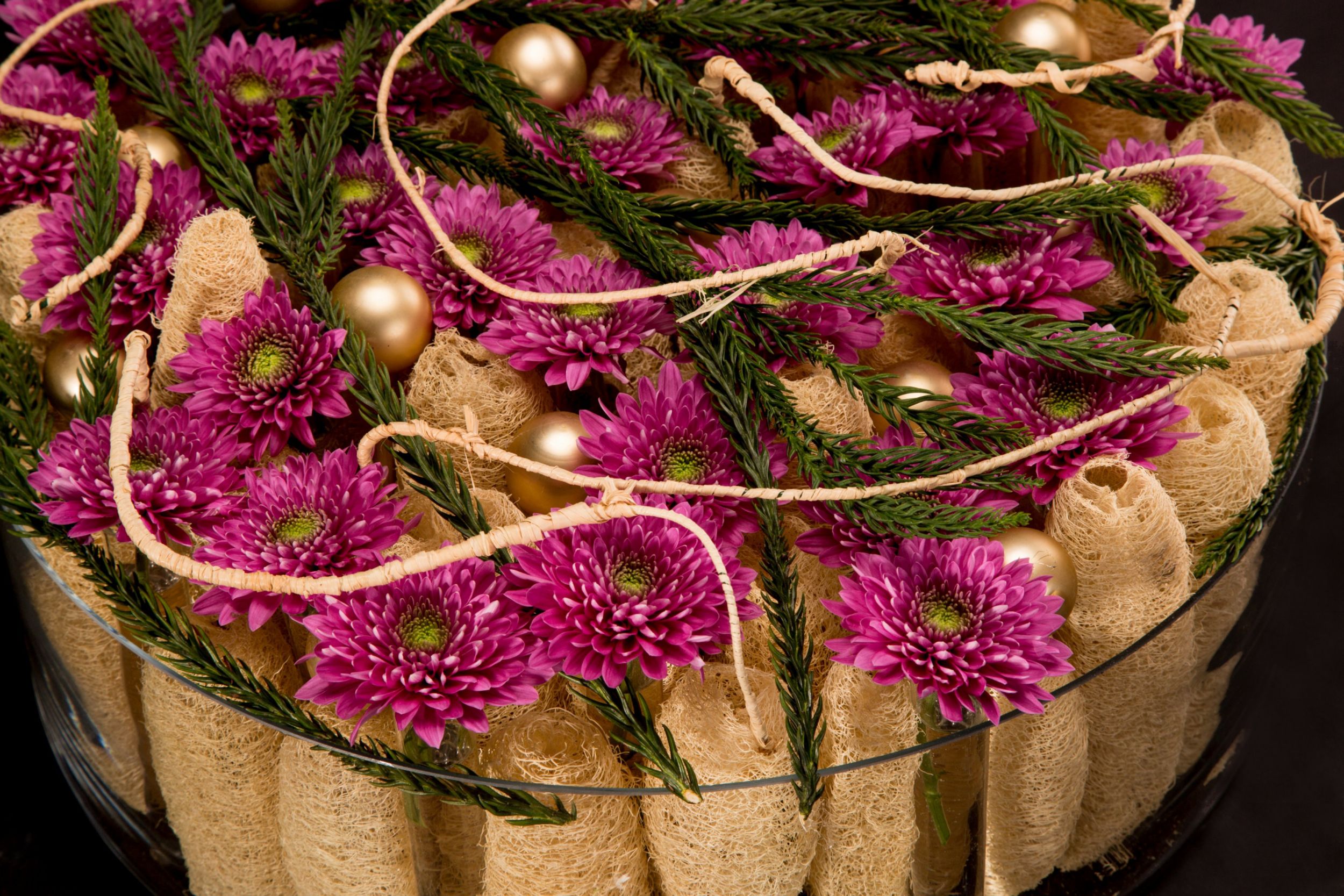 Een makkelijke maar effectieve manier om Chrysanten te gebruiken in een kerst bloemstuk. Roos van Unen heeft een glazen schaal gebruikt en gevuld met luffa's om de glazen buisjes tussen te klemmen om de 'Romance Purple' Chrysanten van Zentoo in te doen.