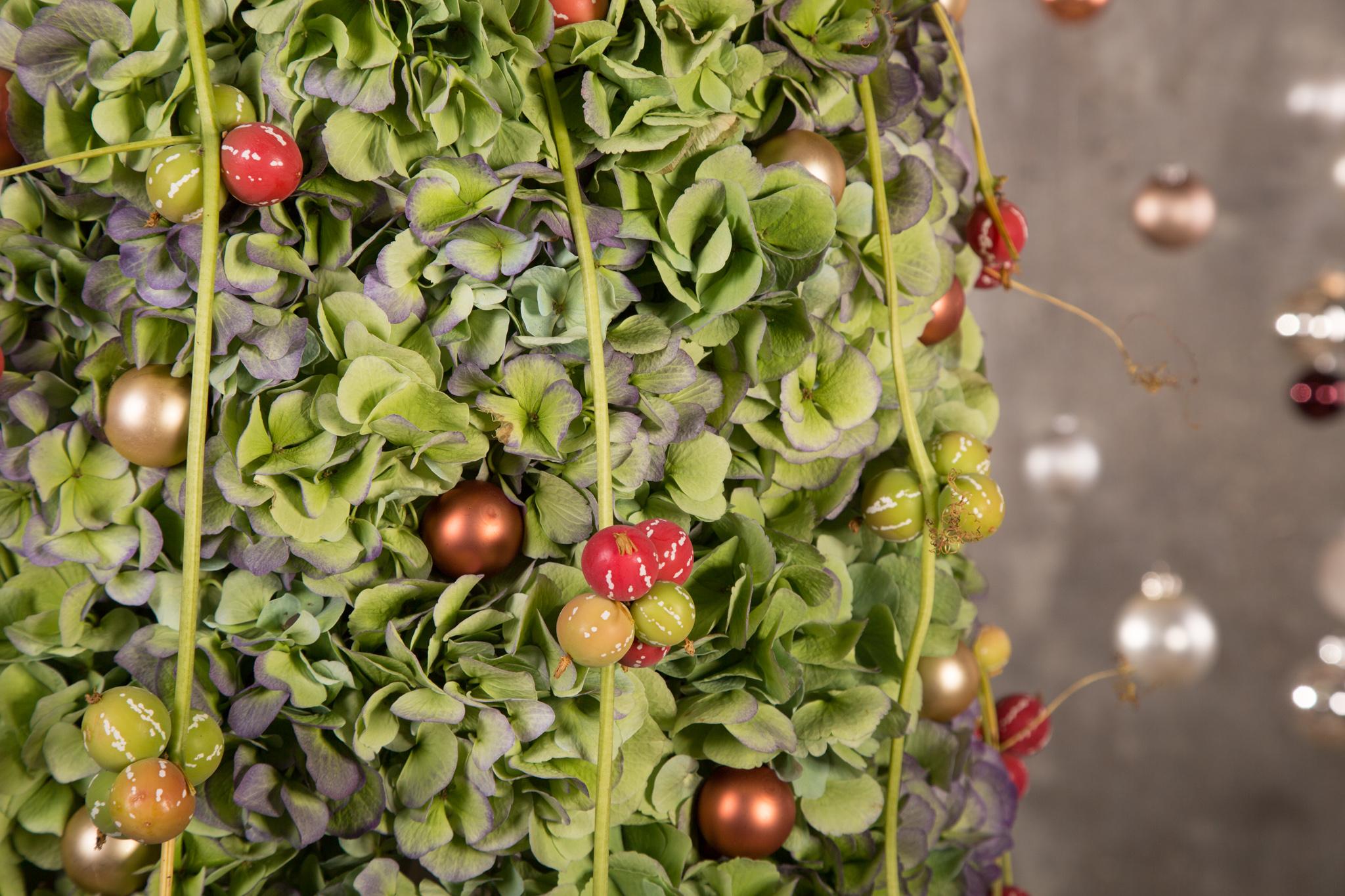 Deze Hortensia's worden 'classic' genoemd omdat ze pas worden gesneden nadat de bloemen door hun kleurverandering zijn gegaan. Resultaat: sterke bloemen in prachtige kleurschakeringen. Perfect voor een bloemwerk wat je lang wilt hebben staan, zoals dit stuk van Pim van den Akker. Door er kleine kerstballen aan toe te voegen en een streng Diplocyclos krijgt het bloemwerk een knipoog naar kerst. Na de kerstdagen zou je de kerstballen kunnen vervangen door gedroogde stukjes fruit of iets anders neutraals waardoor je nog langer van het stuk kunt genieten!