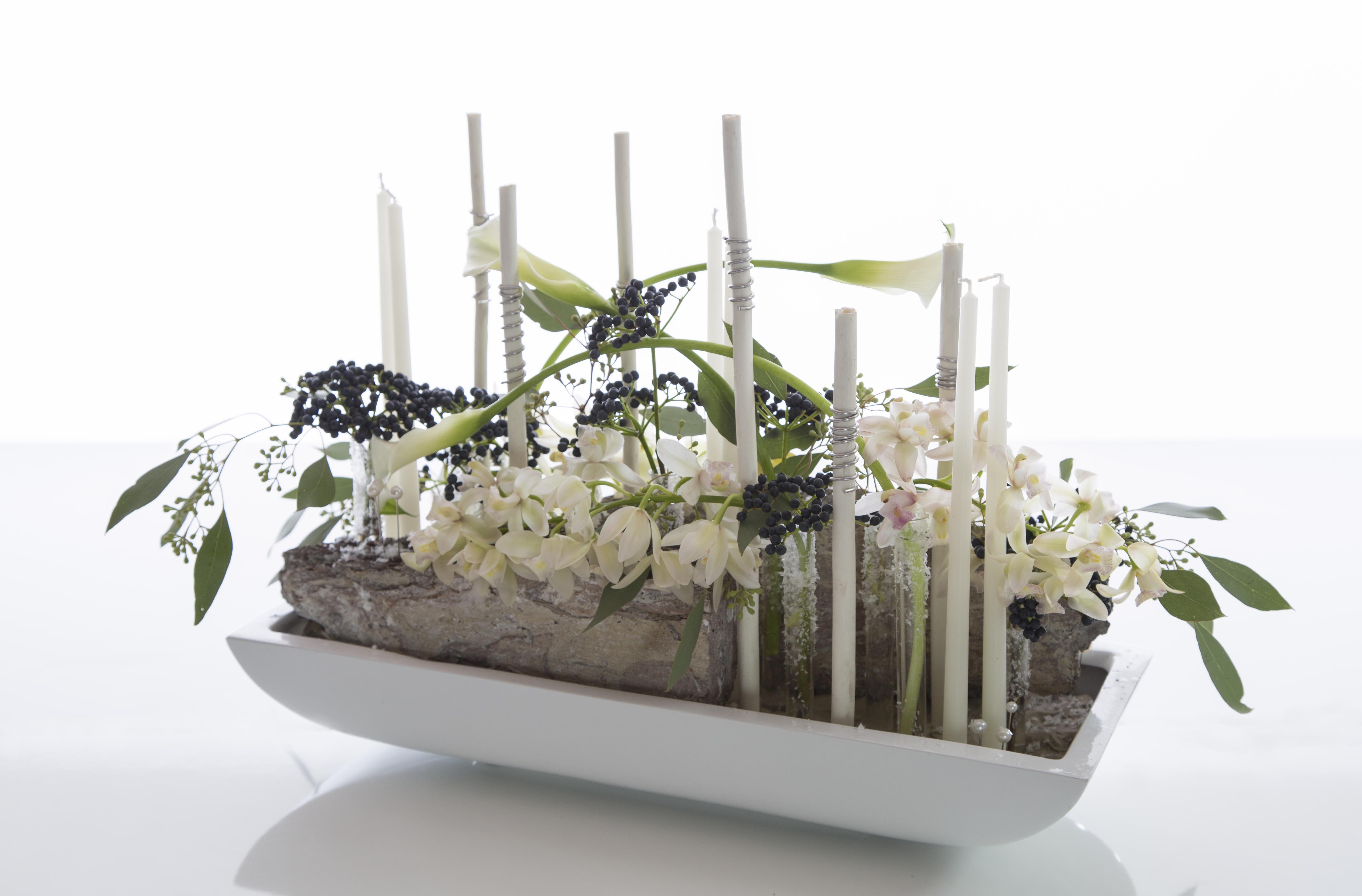 David Ragg used clay as a base for glass tubes, sticks and bark. The glass tubes are filled with Cascade Cymbidiums, Zantedeschia and Viburnum. See how David creates this beautiful piece in the tutorial.