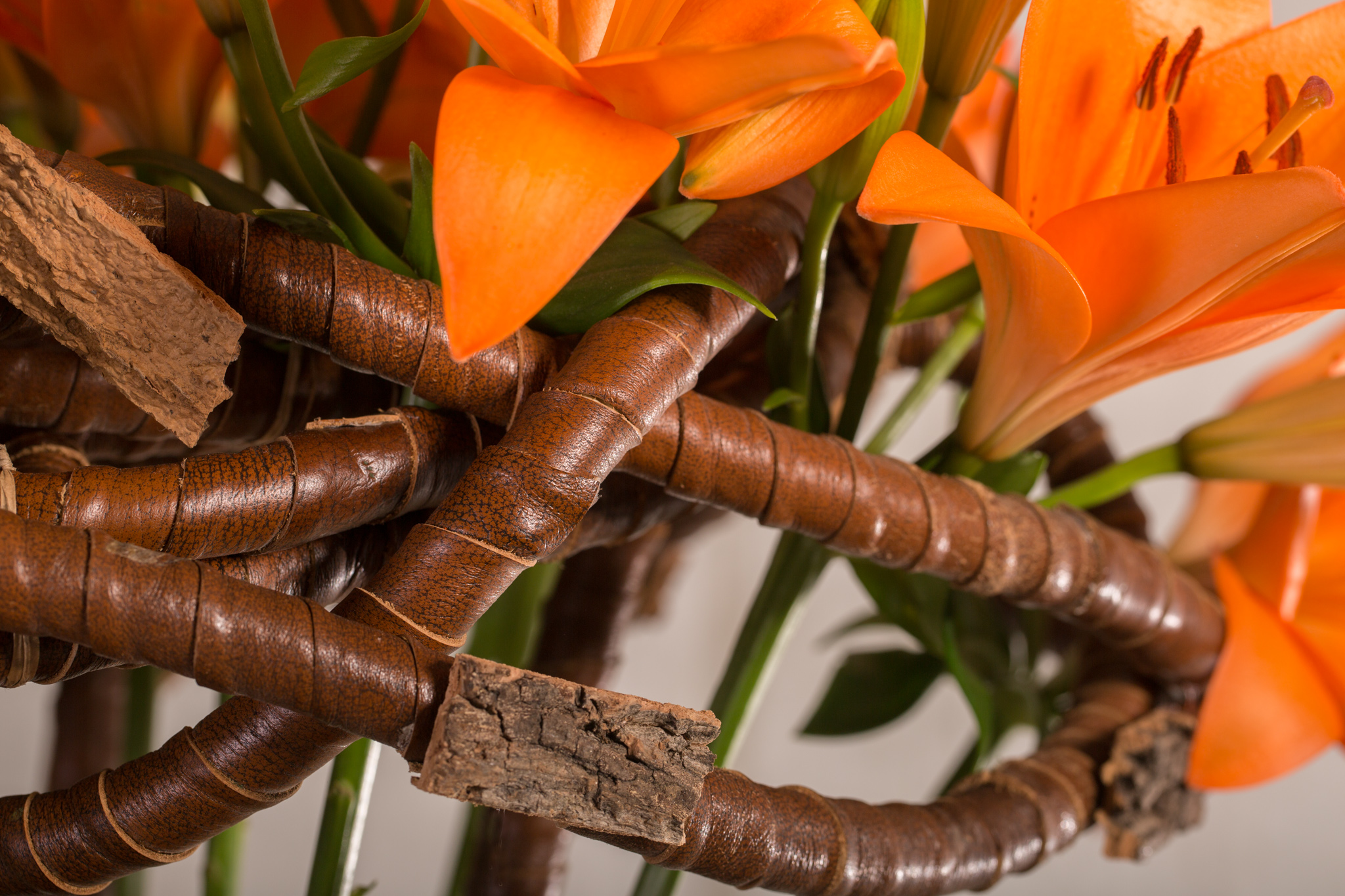 Pim van den Akker maakte een stoer arrangement met de oranje, geurloze 'Sunderland' lelie. De 'Sunderland' lelie van Royal van Zanten Flowerbulbs/Bloems komt prachtig in bloei. Met de sprekende kleur maak je een krachtig statement in je arrangement. Zeker wanneer je de 'Sunderland' solo gebruikt en aankleed met wat stoere details met leer, aardetinten en glooiende vormen. Een mooi groot arrangement met eyecatching oranje lelies geschikt als stoer tafelstuk.