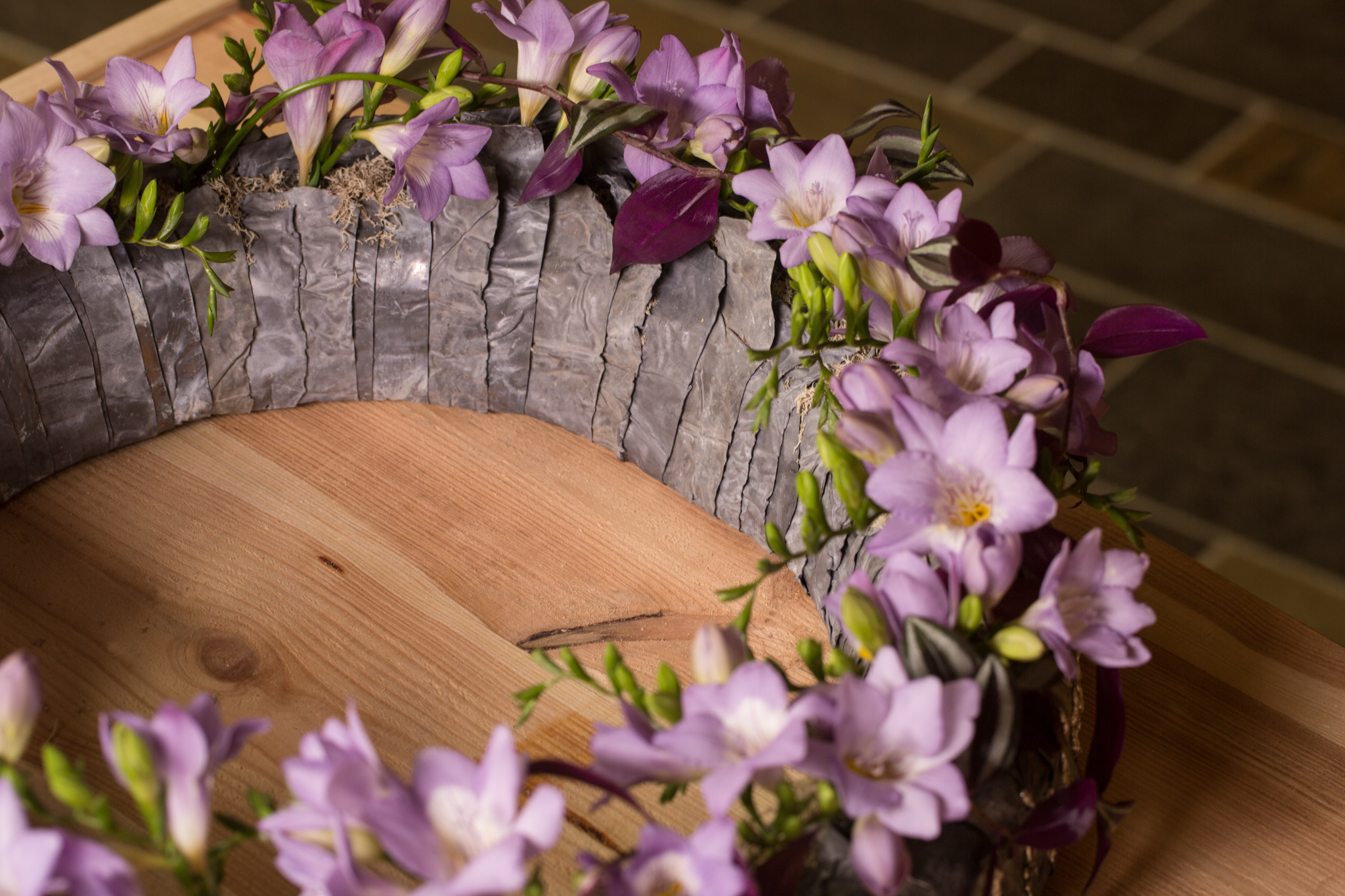 Voorbeeld van afscheidsbloemwerk met Freesia. De Freesia heeft voor veel mensen een emotionele betekenis. Geen wonder dat de bloem veel gebruikt wordt in afscheidsbloemwerk. Roos van Unen maakte deze mooie krans met paarse Freesia en de bladeren van de Tradescantia. De steekschuim ring van OASIS is bedekt met repen snijlood.