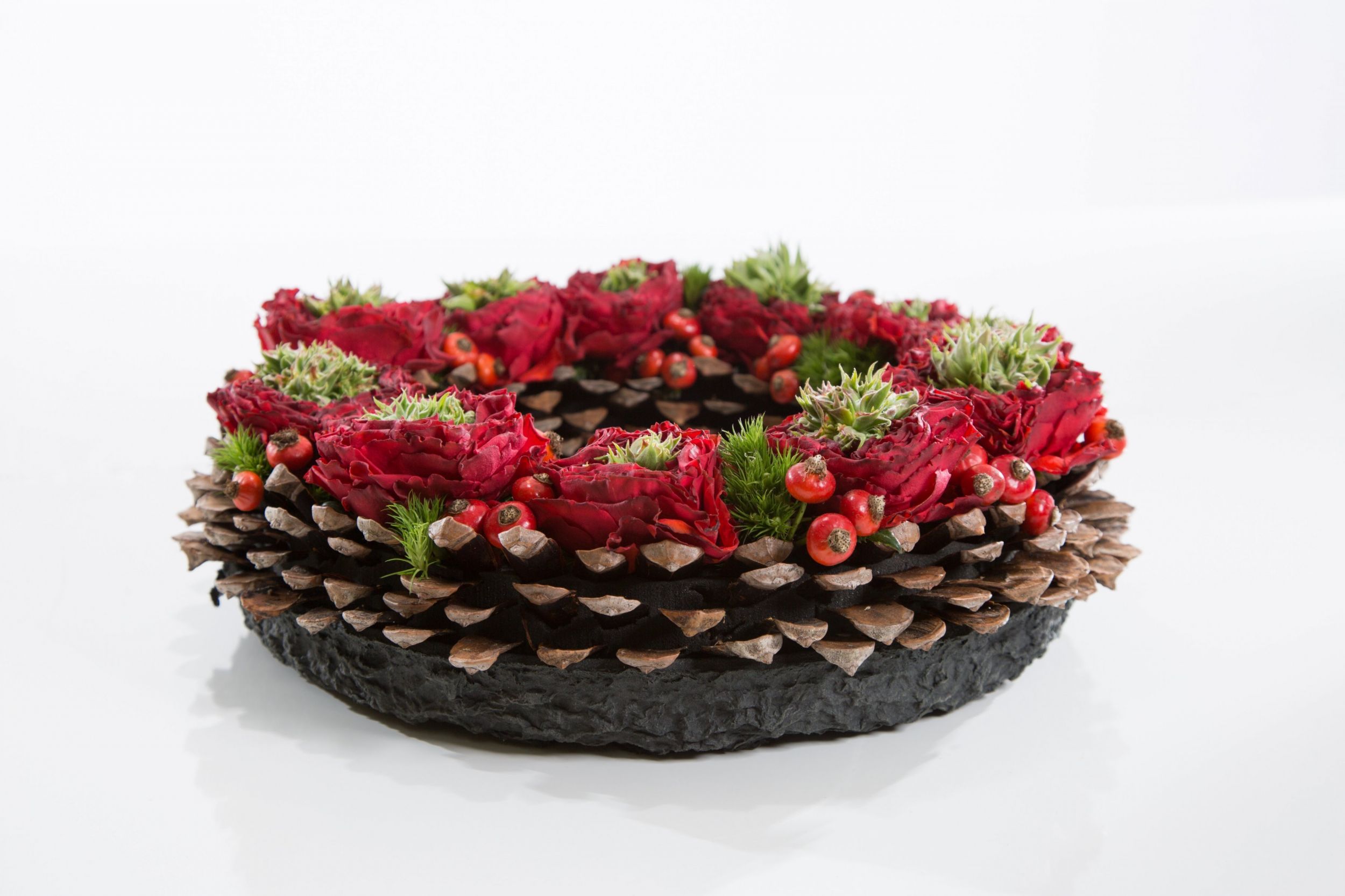 Voorbeeld van een krans op basis van zwart steekschuim. Roos van Unen experimenteerde met de Black BIOLIT krans van OASIS en maakte hier een mooi kerstdesign mee met slechts enkele materialen; een paar prachtige rozen, stukjes dennenappel, wat mos en bessen. Mooi contrast met het zwarte steekschuim en dus extra leuk om dat dan ook nog deels te laten zien!