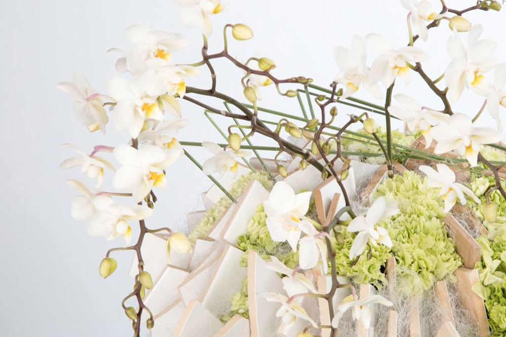 Aardewerk kapot laten vallen? Geen probleem. Britse designer David Ragg maakt met gebroken stukjes tegel en Opti-Multi Venice orchideeën een prachtig arrangement.