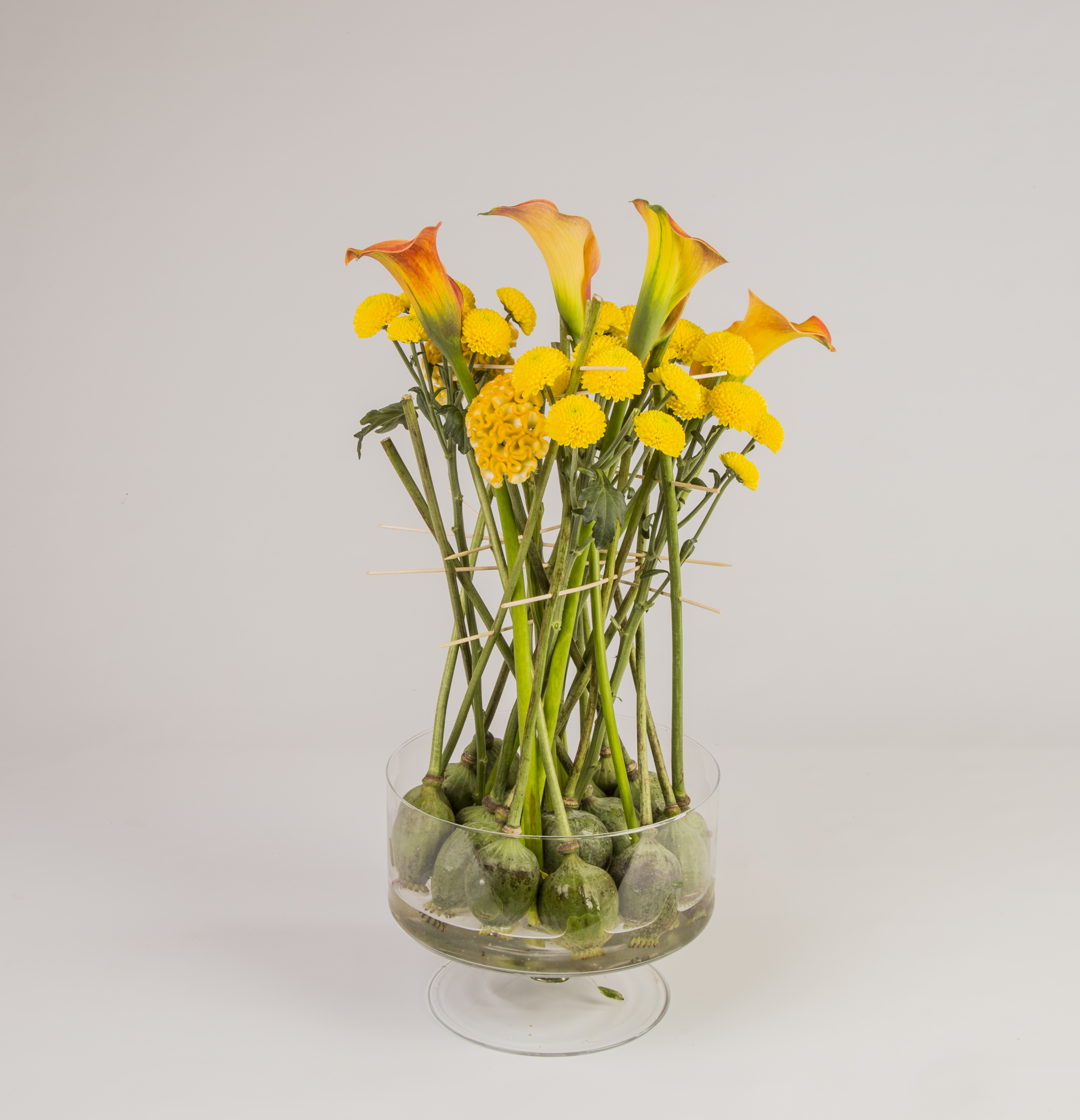 Knalgeel bloemwerk met 'Limoncello' Chrysanten, Celosia, Calla en een basis van ondersteboven geplaatste zaaddozen van papavers.