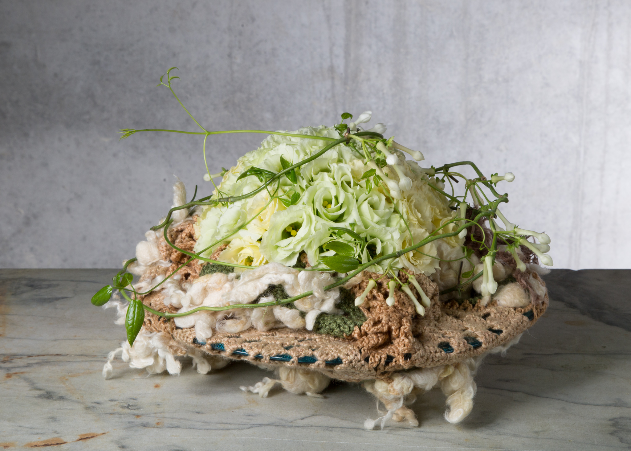 De koude witte tinten van de lisianthus worden prachtig geaccentueerd door het warme breiwerk wat om een glazen schaal is bevestigd.