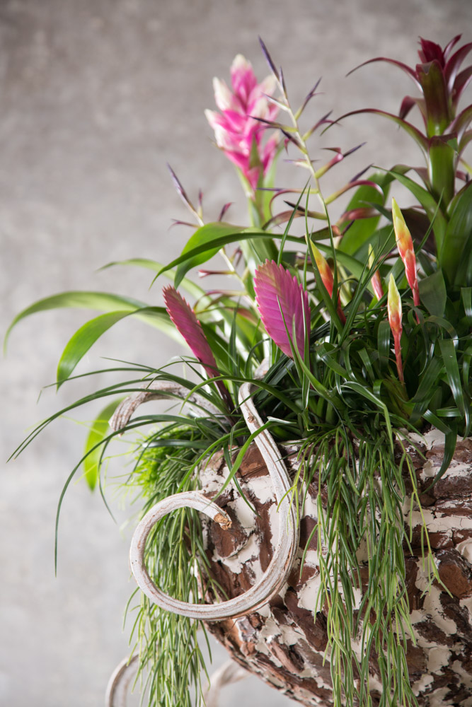 With their outspoken colours, unique flowers and robust leaves these tropical Bromeliads are real characters. Each have their own qualities and placed together in a large plant arrangement they compliment each other nicely. With their lush looks and air purifying properties they are a great addition to any work environment. Plus these plants are strong and require little maintenance which make them perfect for your customers running their own business. Water once every two weeks in their calyx (core of the plant) and they pretty much take care of themselves! This design is from Pim van den Akker, see his how to make tutorial here!