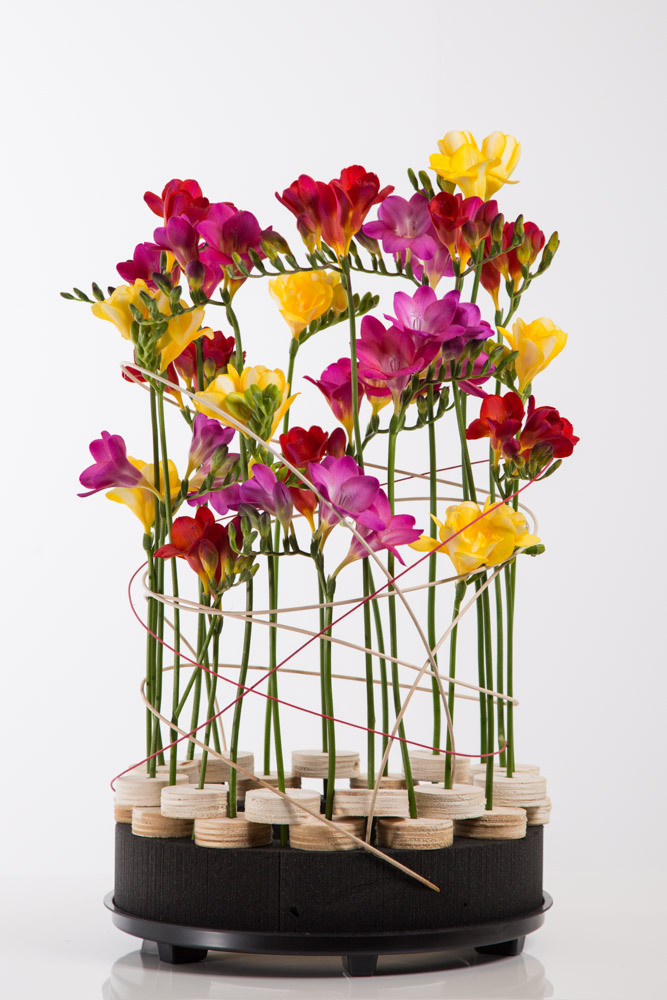 De ronde bewegingen en vormen overheersen in dit #FreestyleFreesia design gemaakt door Roos van Unen. Het effect wordt vergroot door de kleurrijke Freesia op verschillende lengtes in het design te verwerken. Het ronde design is gemaakt in Black Ideal steekschuim van Oasis voor het contrast tussen zwart en de verschillende felle kleuren van de Freesia.