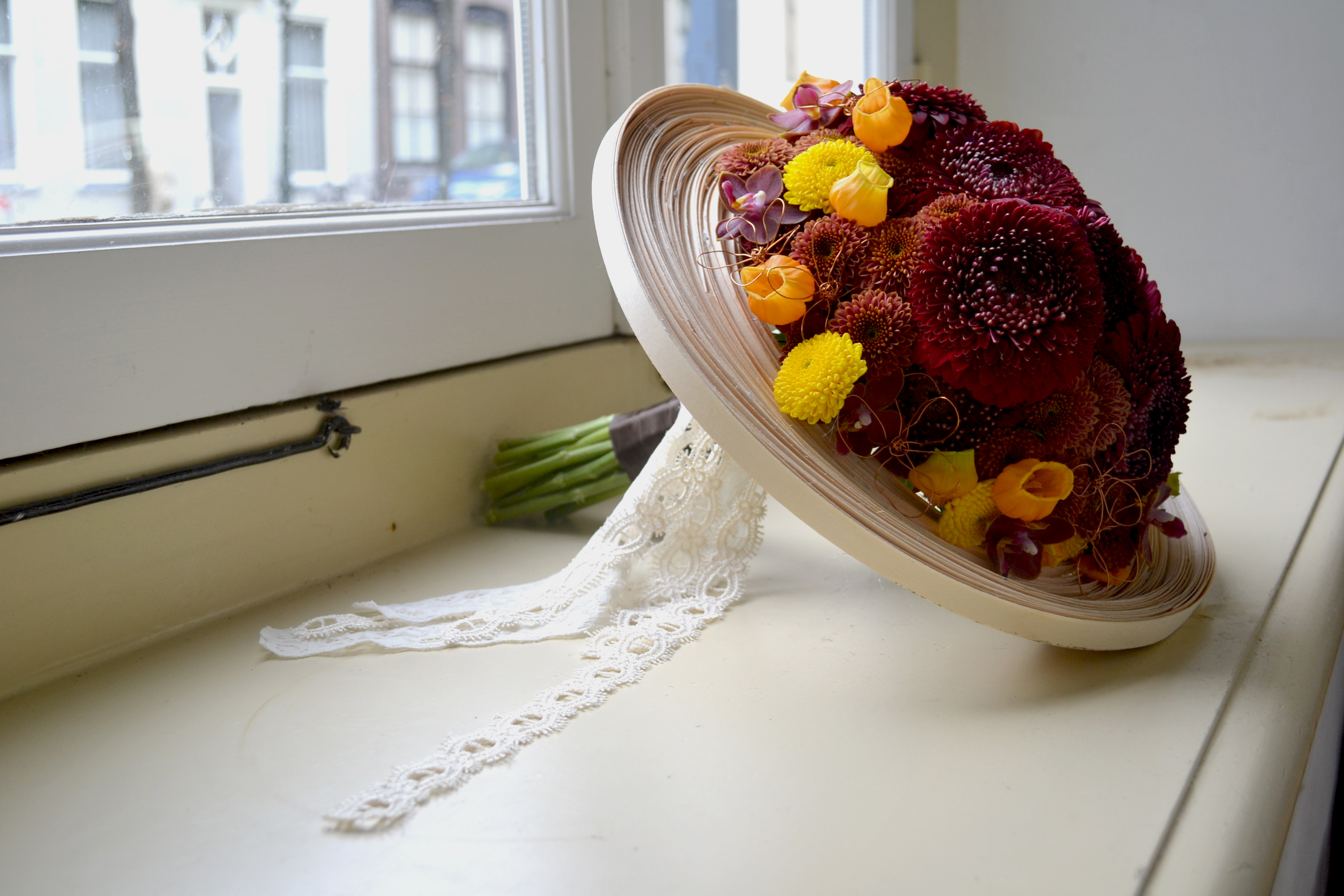 Boeket met chrysanten, gerbera's en sandersonia in een basis van hout fineer met aluminium draad, gemaakt door onze inspired by florist Jantine van Bruggen.