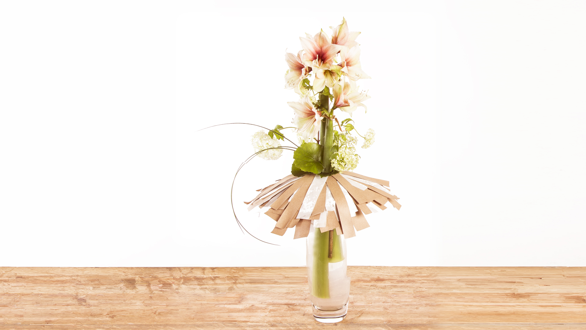 Creatief boeket met Amaryllis, Viburnum en Galax gemaakt door Bea Beroy. Het frame is gemaakt van karton en papier waarbij de techniek lijmen is toegepast. Door het verwerken van andere materialen zoals papier ontstaan er leuke creaties.