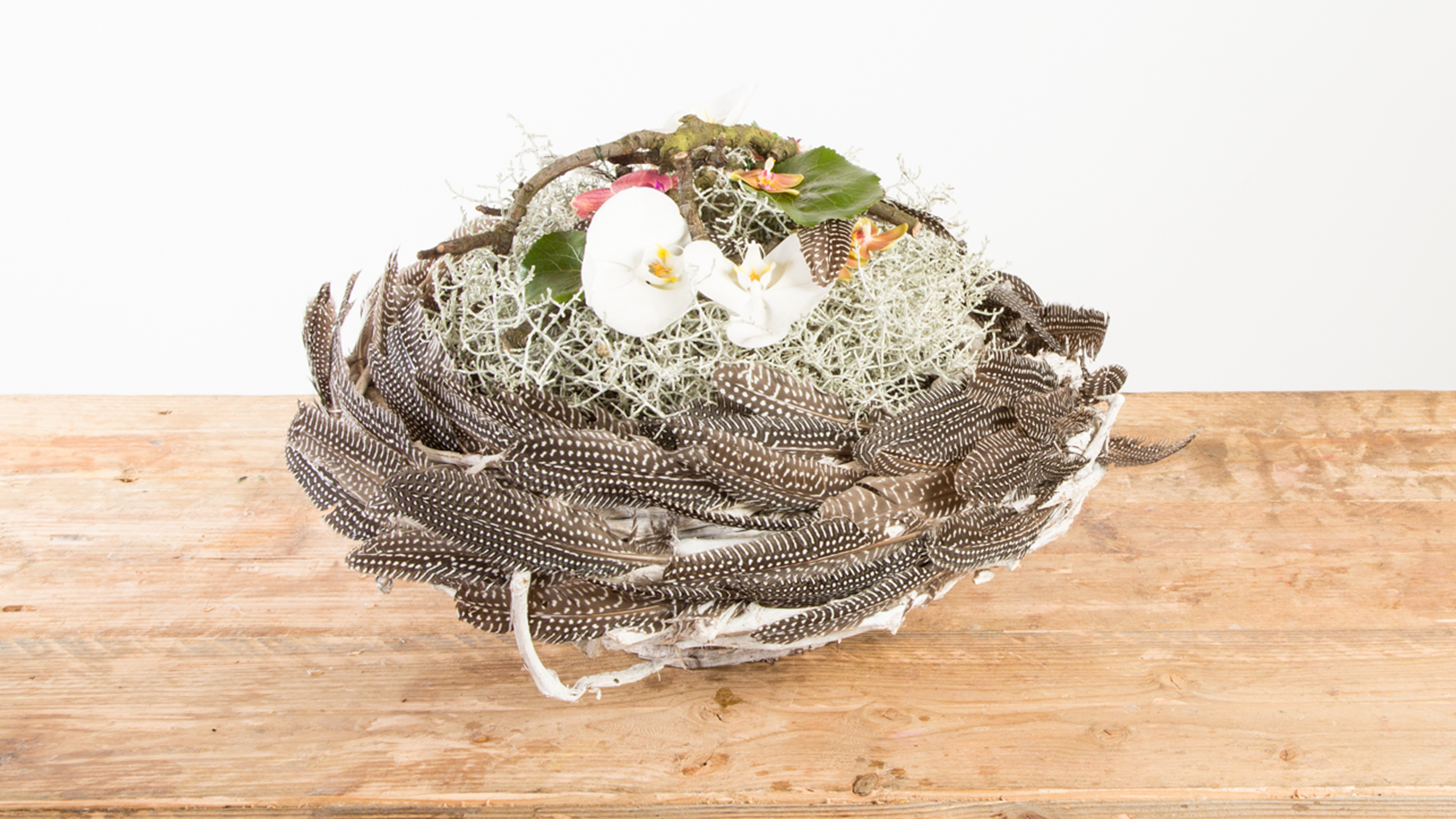 Alex laat zien hoe je met veren en een krans een unieke ondergrond kunt maken. Het arrangement is passend in het binnen- en buiteninterieur.