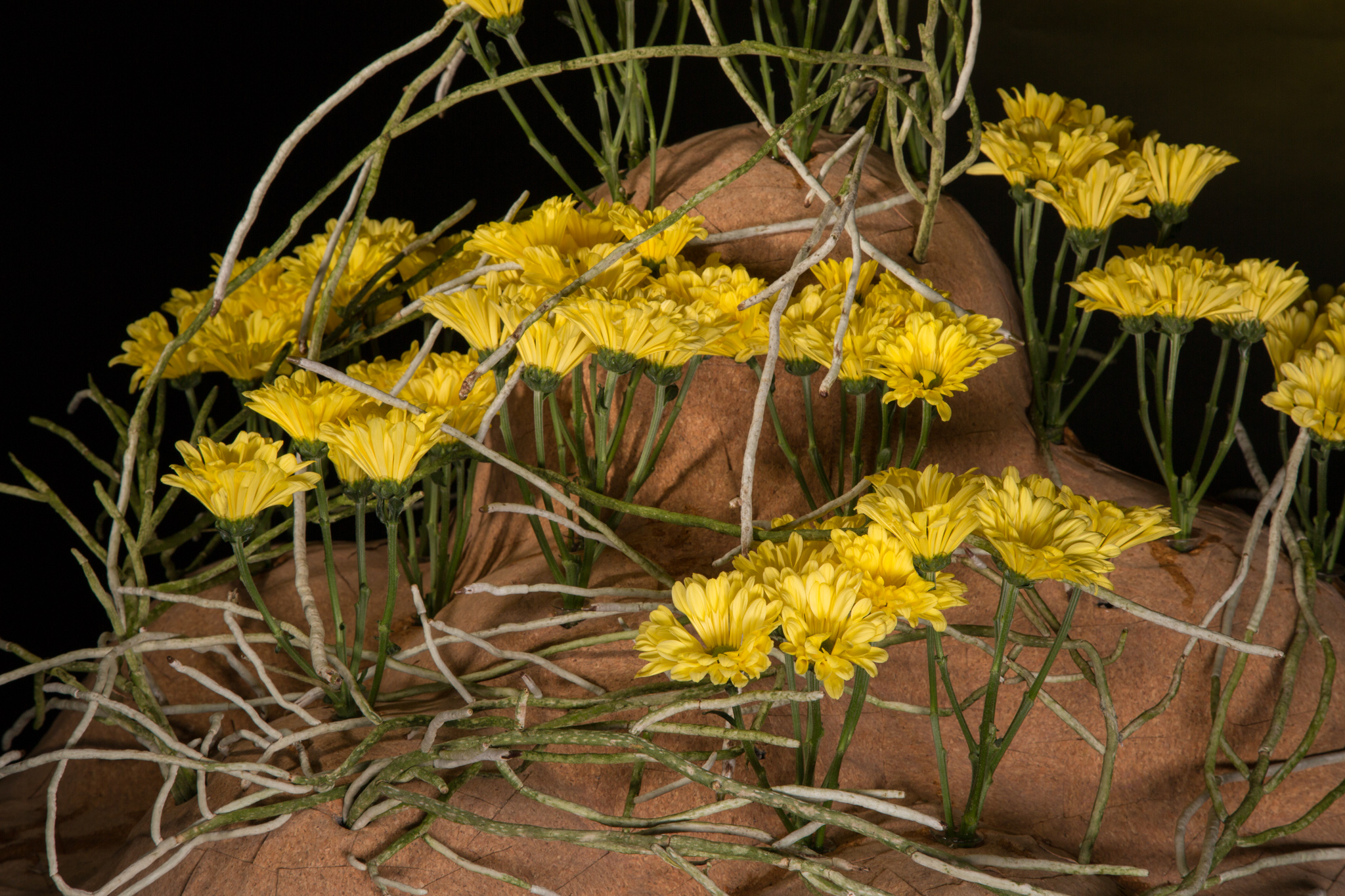Chrysant 'Nibali' is een sterke nieuwe variëteit met een bijzondere eigenschap: zodra de bloem wordt geoogst, sluit de bloem haar blaadjes en opent ze pas weer zodra de bloemen in water staan. Zo onthult ze langzaam aan haar bijzondere frisgroene hart. Pim van den Akker plaatste de 'Nibali' in een object met organische vormen waarin de bloemen worden gekoesterd.