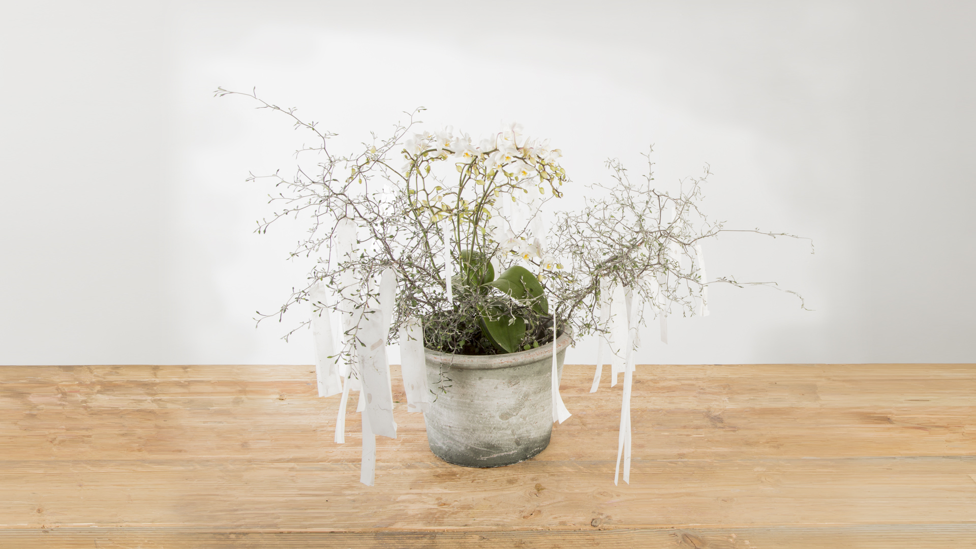 Bea maakt een orchideeënboom waarin persoonlijke wensen kunnen worden opgehangen voor het nieuwe jaar. Leuk en origineel om in je winkel te presenteren!