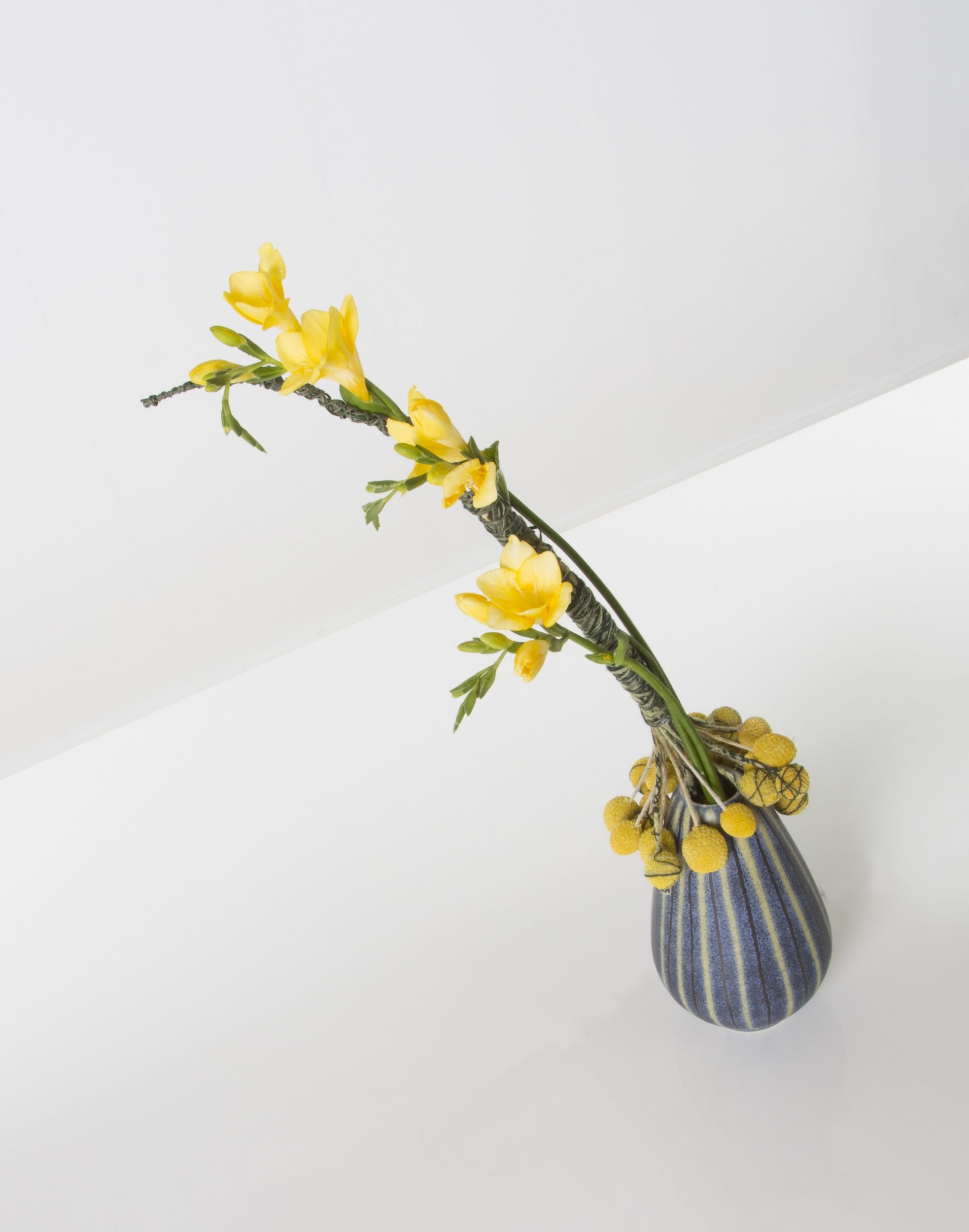 Door de manier waarop Roos van Unen de Craspedia bolletjes verwerkt in combinatie met de gele Freesia, maak je met weinig en relatief goedkoop materiaal een snelle en interessante basis! Er wordt een tuiltje van de bolletjes gemaakt en ondersteboven verwerkt. Opeens verandert het tuiltje in een interessant design.