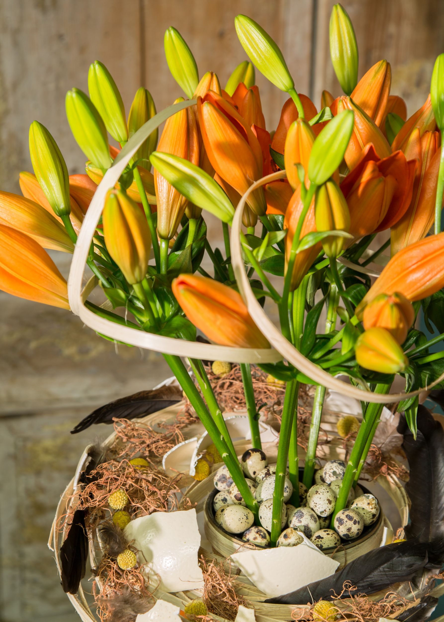 Oranje in je paasbloemstuk kan heel goed werken. Wanneer de oranje Sunderland lelie van Royal van Zanten Flowerbulbs helemaal open komt, steelt hij de show! Als je deze sterke lelies met hun opvallende kleur verwerkt maak je zeker de blits. Daarnaast zijn de Sunderland lelies geurloos. Leuk om zo'n uitgesproken kleur te gebruiken in paasbloemwerken. Voeg nog wat paasdetails toe zoals eierschalen om het compleet te maken.