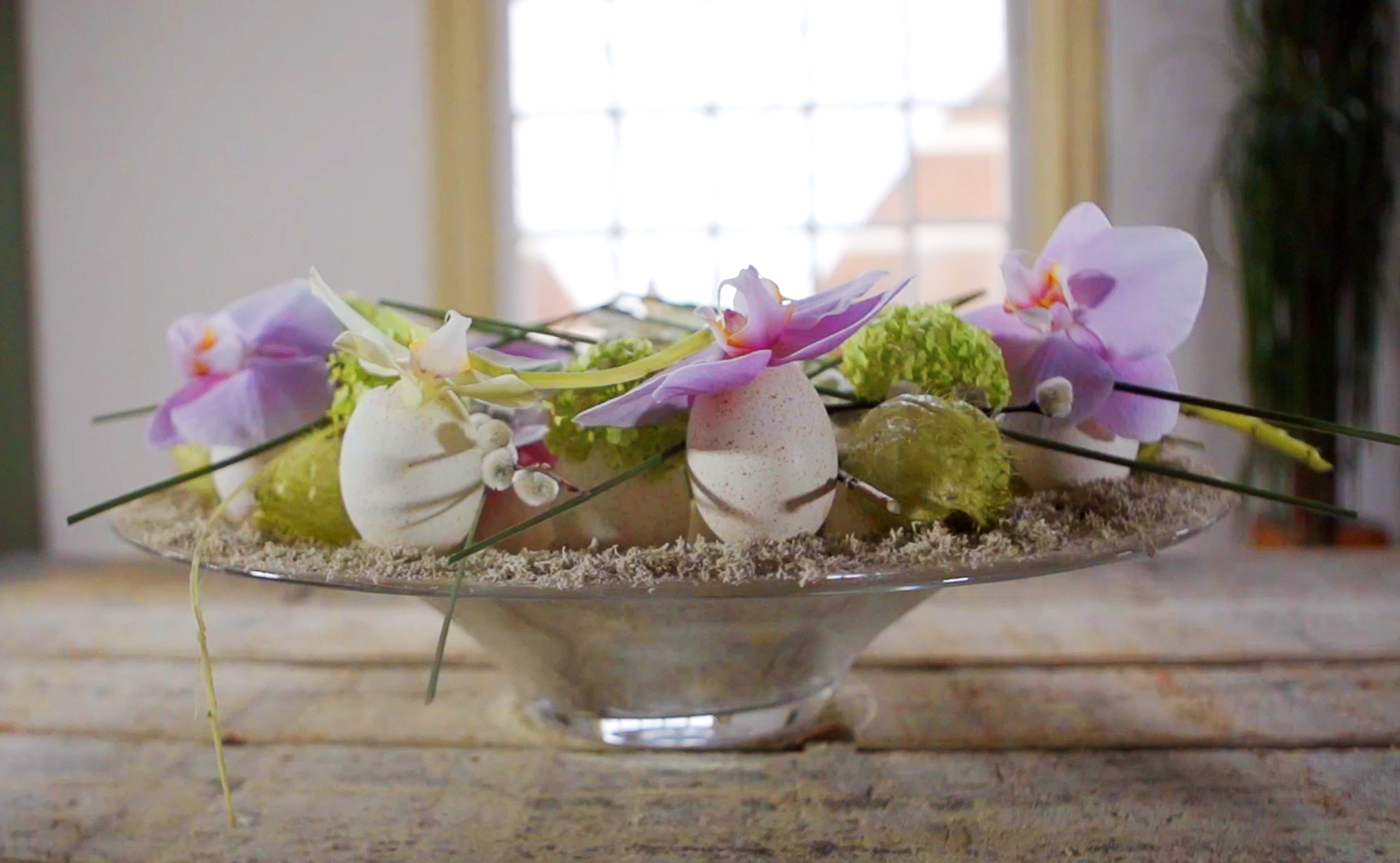 Pasen is niet alleen geel en groen: licht roze orchideeën zorgen voor zoetheid in de creatie van Pim van den Akker.