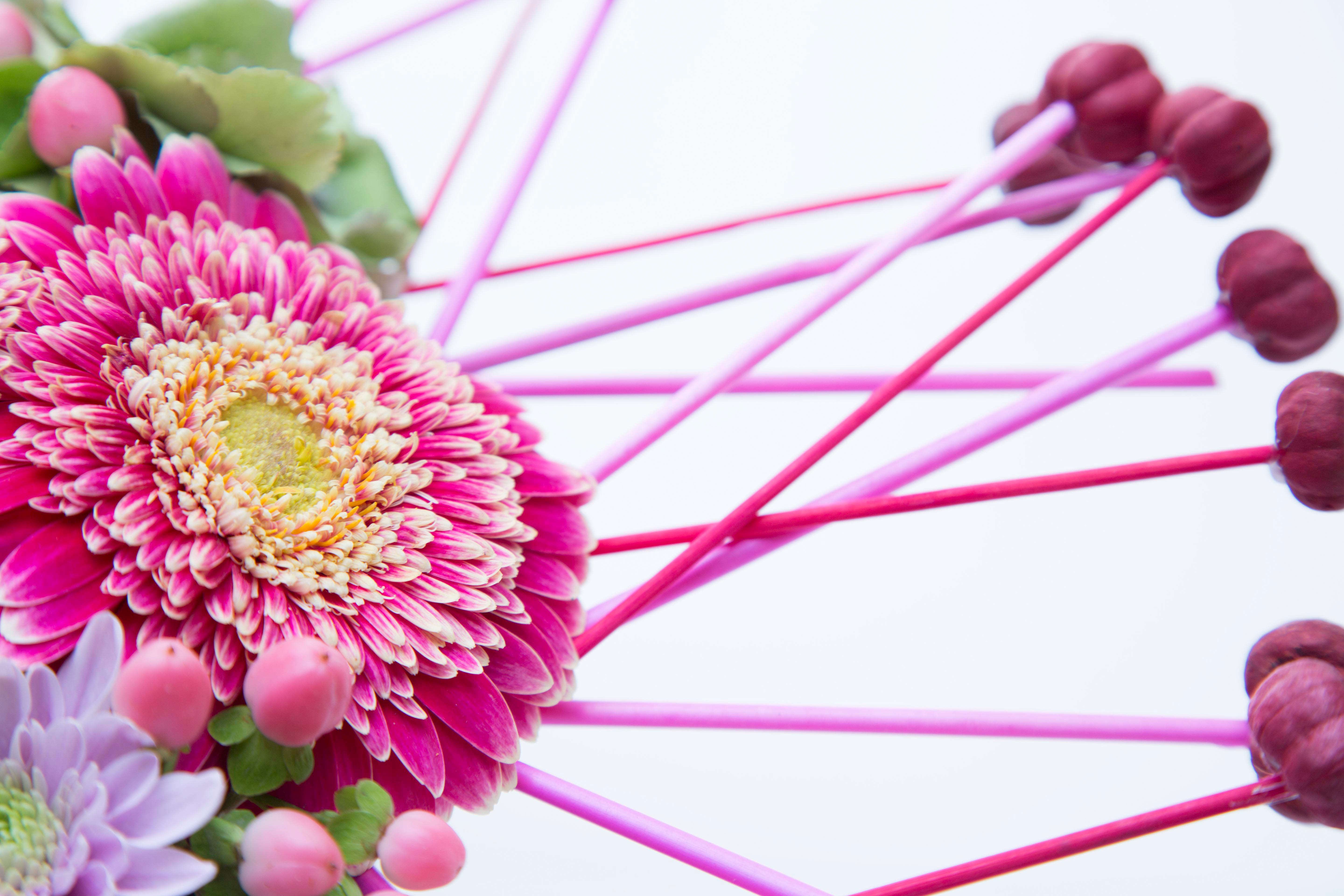 Een mooie manier om een geliefde te eren is door het afscheidsbloemwerk in hartvorm te maken. Alex Segura gebruikte hartvormig steekschuim en vulde het met gerbera's ‘Selfie’, chrysant ‘Belicia Pink’, hortensia, hypericum, pistache blad en gedroogde bessen.