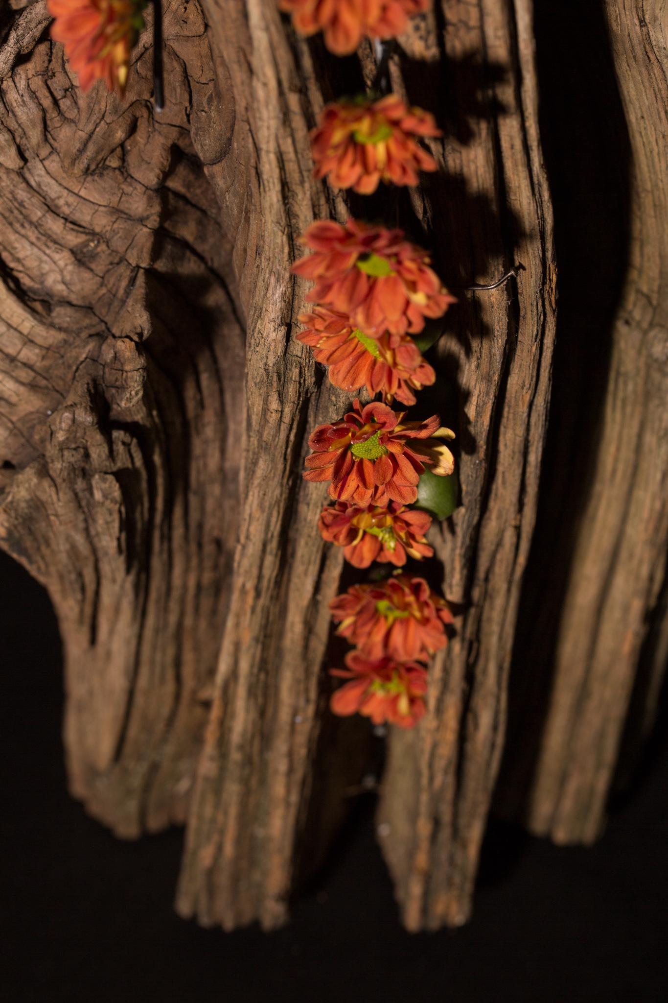 Een juweel uit de schatkist van Zentoo: de santini Chrysant 'Pimento Orange'. Deze warme kleur Chrysant is prachtig voor najaarsbloemwerk want ze combineert prachtig met bessen, schors en andere typische herfstmaterialen. Roos van Unen maakte dit bloemwerk met herfstbos-gevoel. Je zou zelfs de bloemen kunnen beschouwen als herfstbladeren die van de boom vallen...