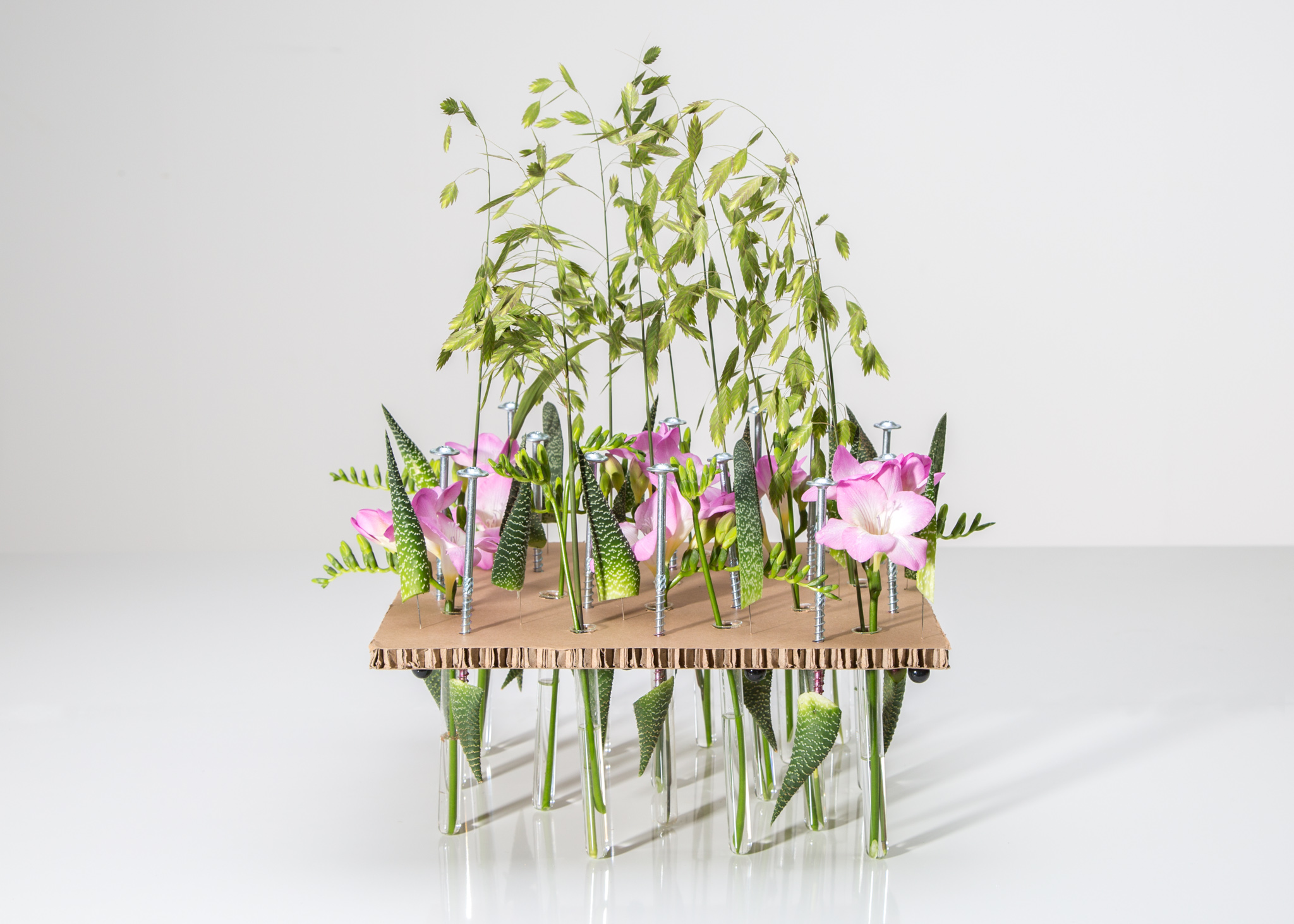 Bijzonder groen met een klassieke schoonheid als de Freesia combineert tot een verrassend bloemstuk. In dit bloemwerk van Nelleke Bontje zijn bladeren van de Aloë verwerkt en Chasmanthium. De glazen steekbuisjes zitten vast in een stuk heel dik karton. Tijdens de Freestyle werden de designers geprikkeld om met vreemde materialen te werken en zo ontstond het idee om met dikke schroeven te werken die in dit geval alleen decoratief zijn en verre van functioneel.
