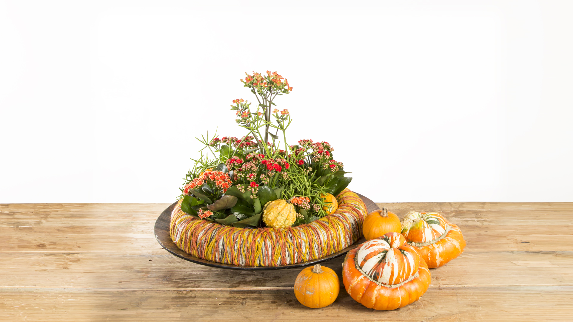 Gaaf plantenarrangement in herfstsfeer gemaakt door Bea Beroy met Kalanchoë en pompoenen.